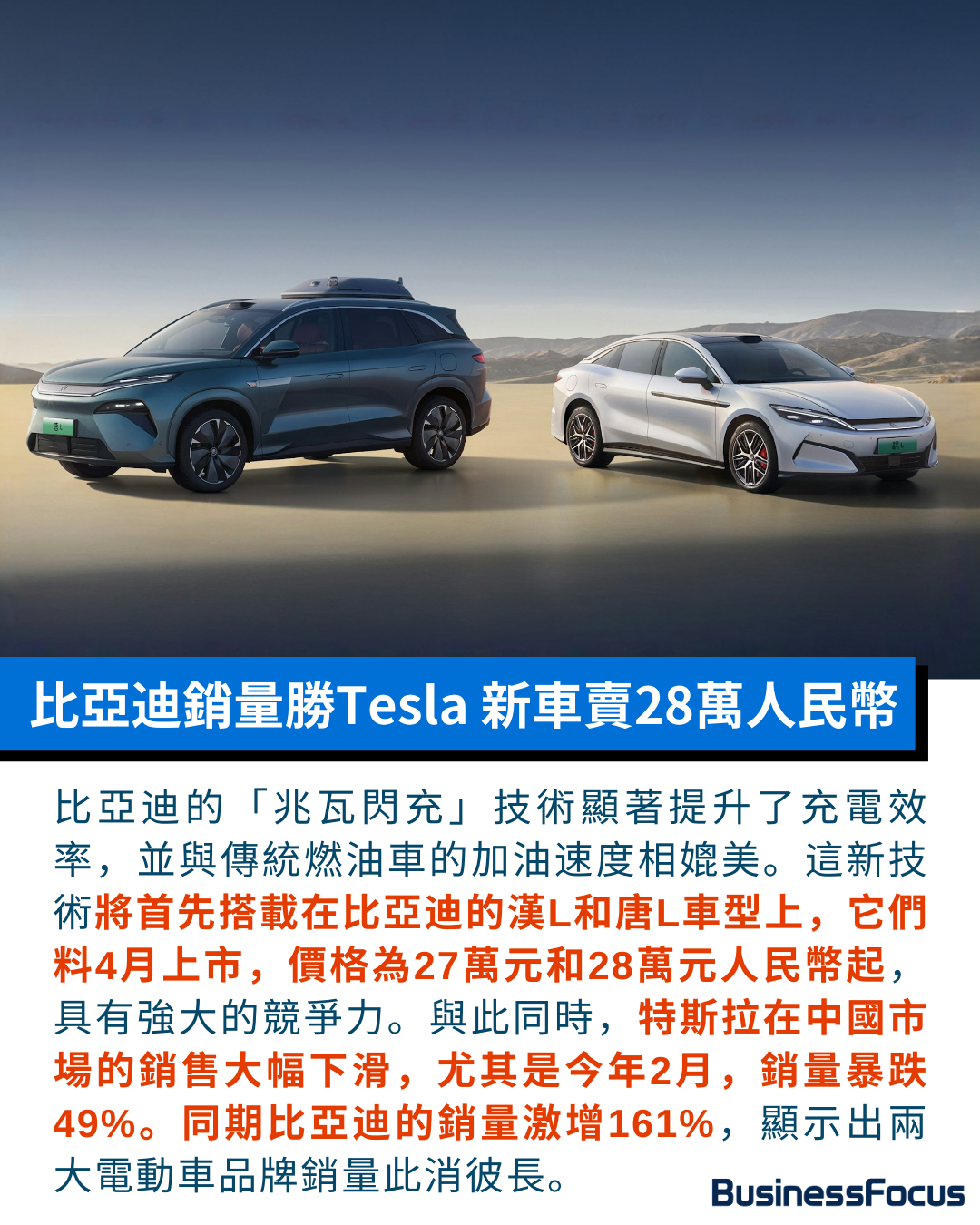 比亞迪董事長王傳福前日在發布會上宣布推出「兆瓦閃充」新技術,能讓旗下新型電動車只需充電5分鐘,即能實現400公里續航,做到「油電同速」,這充電速度較最大競爭對手Tesla(特斯拉)的超級充電技術還要快3.5倍,震驚全球。消息傳出後,比亞迪(1211)股價連續兩天創歷史新高,今早最多即曾漲4.2%至418.4元;反觀Tesla股價跌不停,股價昨再挫5.3%至225.31美元。