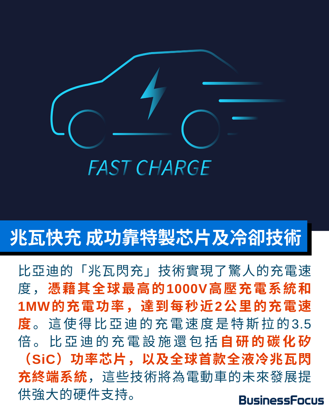 比亞迪「兆瓦閃充」何以做到充電5分鐘續航400公里的驚人表現?答案在比亞迪擁有全球量產最高的1000V高壓充電系統,搭配最大充電電流1000A和最高充電功率1MW(1000kW),實現了每秒接近2公里的峰值充電速度。對比之下,Tesla超級充電站目前最高功率僅為500kW,充電15分鐘續航275公里,所以比亞迪閃充速度理論上較Tesla快近3.5倍。