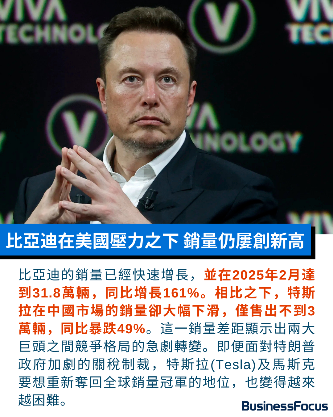 比亞迪的崛起並非一夜之間。根據最新數據,2025年2月,比亞迪全球銷量達到31.8萬輛,同比增長161%,而Tesla中國市場僅售出不到3萬輛,同比暴跌49%。彭博行業研究分析師指出,比亞迪的純電動車銷量正在快速追趕甚至超越其混合動力車型,這與去年落後特斯拉的局面截然不同。即使美國總統特朗普推動的關稅制裁加劇,Tesla要想重奪全球電動車銷量冠軍已變得愈來愈困難。