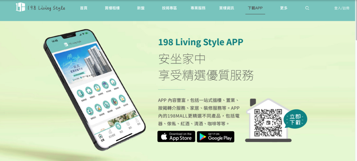 為詳細了解及實測上述的一條龍置業服務,記者下載了名為「198 Living Style」的手機App,只要用手機號碼,即可免費註冊及使用它的「一站式置業按揭平台」。記者實測此手機App時,第一個深刻的印象便是其功能的全面性,遠超市場上其他地產公司的類似手機程式。