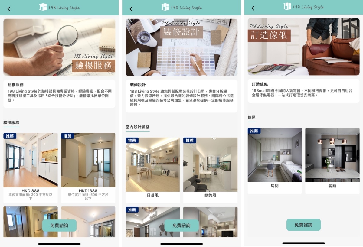 但即使成功買樓及收樓,之後仍往往需為裝修及傢俬等問題煩惱。但記者發現「198 Living Style」手機App在這方面的支援亦極為全面,因它提供的專業服務涵蓋「裝修設計」、「訂造傢俬」,「訂購人氣電器」、「智能家居系統設計及安裝」以及「家居服務(如清洗冷氣、除甲醛及消毒等)」等,真正做到一站式置業服務。