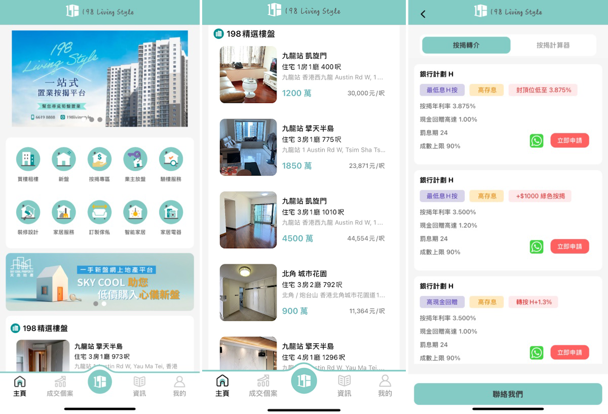 假如成功買樓,下一步便要立即找銀行做按揭;若買的是一手樓,收樓時買家一般更會聘用驗樓師為單位驗樓,以便要求發展商執漏。「198 Living Style」App在這兩方面都服務齊全,以「按揭專區」為例,記者發現除了有按揭計算機,該App還即時比較及羅列了不同銀行的按揭計劃的息率、現金回贈比率及按揭成數上限,讓用家一目了然。買家亦可即時用App聯絡「198按揭專員」申請最優惠的按揭計劃。驗樓服務方面,「198 Living Style」指其驗樓師均具備專業資格,並會使用不同高科技驗樓工具協助分析,以準確找出單位問題所在。
