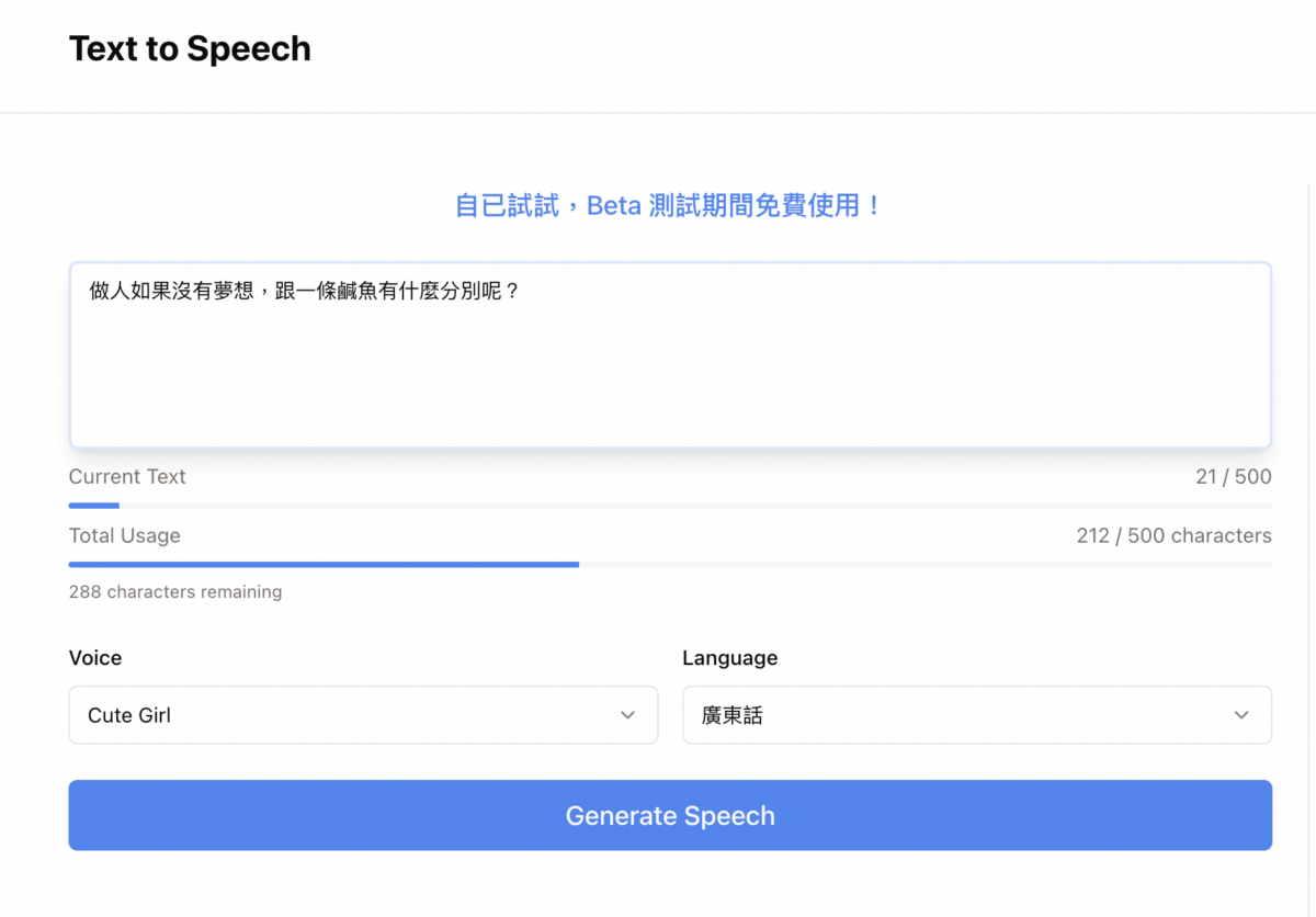 這一個 Text to Speech(文字轉語音)的平台,開發者為阿石,在上月開放免費測試版予所有人使用。不過,昨日阿石亦在個人社交平台上宣佈,免費測試版本將在下周關閉,並推出正式版,屆時將邀請100位用戶優先測試。