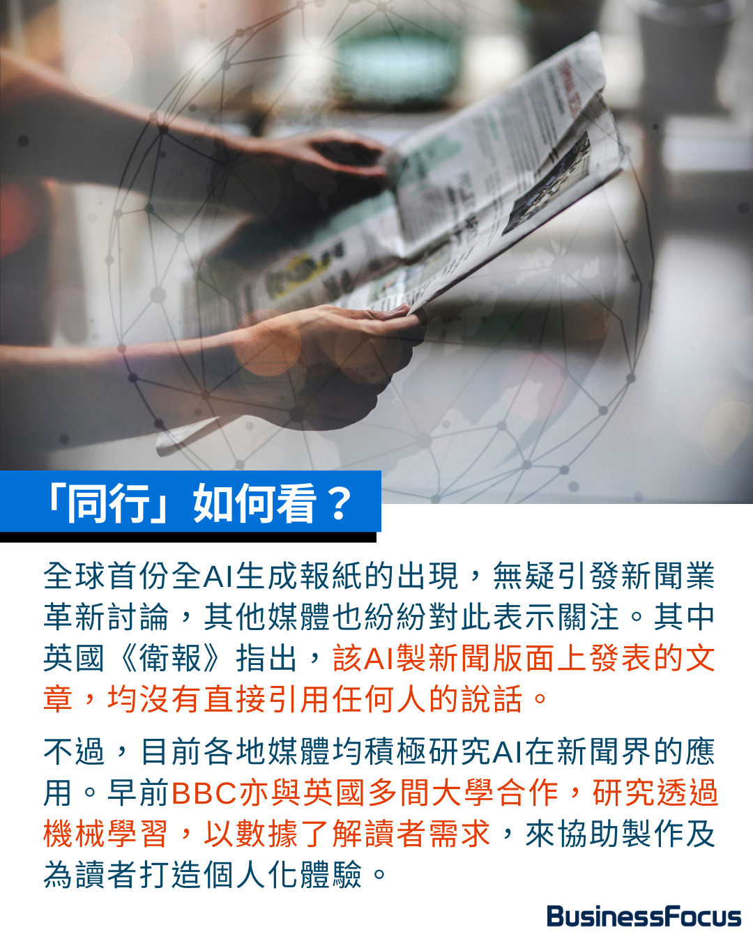 不過,目前各地媒體均積極研究AI在新聞界的應用。早前BBC亦與英國多間大學合作,研究透過機械學習,以數據了解讀者需求,來協助製作及為讀者打造個人化體驗。