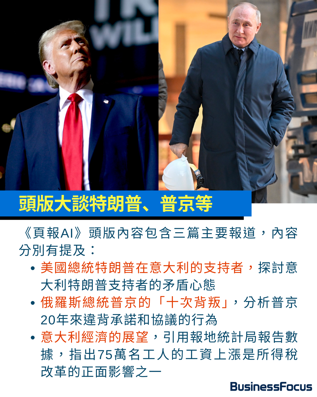 全球首份AI製報紙 意大利《頁報》推一個月新聞實驗 首份頭版大談特朗普、普京