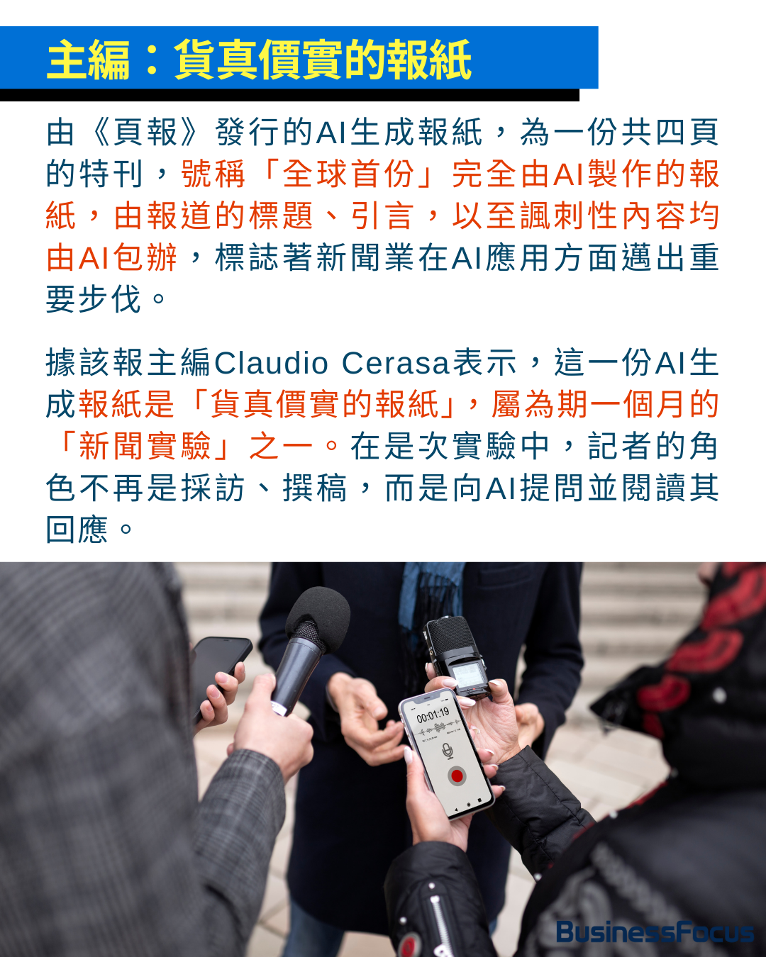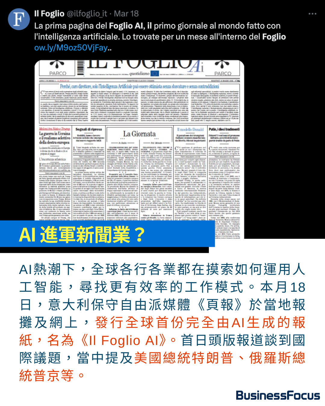 全球AI熱潮下,各行各業都在摸索如何運用人工智能(AI),尋找更有效率的工作模式,而近日熱潮亦在新聞界掀起話題。本月18日,意大利保守自由派媒體《頁報(Il Foglio)》,於當地報攤及網上,發行全球首份完全由AI生成的報紙,名為《Il Foglio AI》。首日頭版報道中談到國際議題,當中提及美國總統特朗普、俄羅斯總統普京等。
