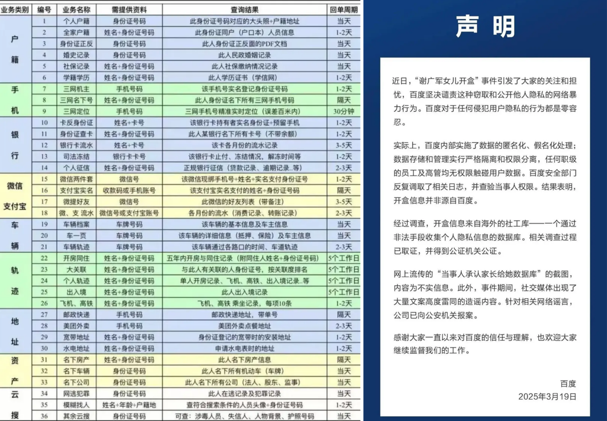 事件在內地引發大風波,主因是內地網民懷疑少女A偷入父親的百度工作戶口,把受害人起底。不過謝廣軍及百度均否認有此事,指部分網上通話截圖乃捏造的,故公司亦已向公安報案。百度聲明稱,百度內部實施了資料的匿名化、假名化處理;資料存儲和管理實行嚴格隔離和許可權分離,任何職級的員工及高管均無許可權觸碰使用者資料。百度安全部門反覆調取了相關日誌,並查驗當事人許可權。結果表明,「開盒(起底)」資訊並非源自百度。經過調查,開盒資訊來自海外的社工庫:即一個通過非法手段收集個人隱私資訊的資料庫。相關調查過程已取證,並得到公證機關公證。