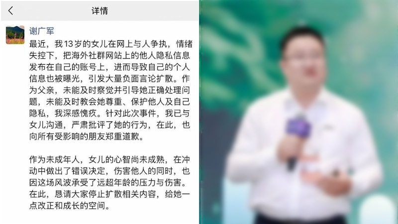 內媒則報道,風波中的主角即13歲少女的父親謝廣軍,傳出已辭去月薪22萬的副總裁一職,但消息未獲官方證實或否認。謝廣軍早前則代表女兒在網上公開致歉,他表示:「我13歲的女兒在網上與人爭執,情緒失控下,把海外社群網站上的他人隱私信息發布在自己的賬號上,進而導致自己的個人信息也被曝光,引發大量負面言論擴散。作為父親,未能及時察覺並引導她正確處理問題,未能及時教會她尊重、保護他人及自己隱私,深感愧疚,向所有受影響的朋友鄭重道歉。」針對此次事件,謝廣軍表示已與女兒溝通,並嚴肅批評其行為,也懇請網友停止擴散相關內容,給未成年人改正和成長空間。