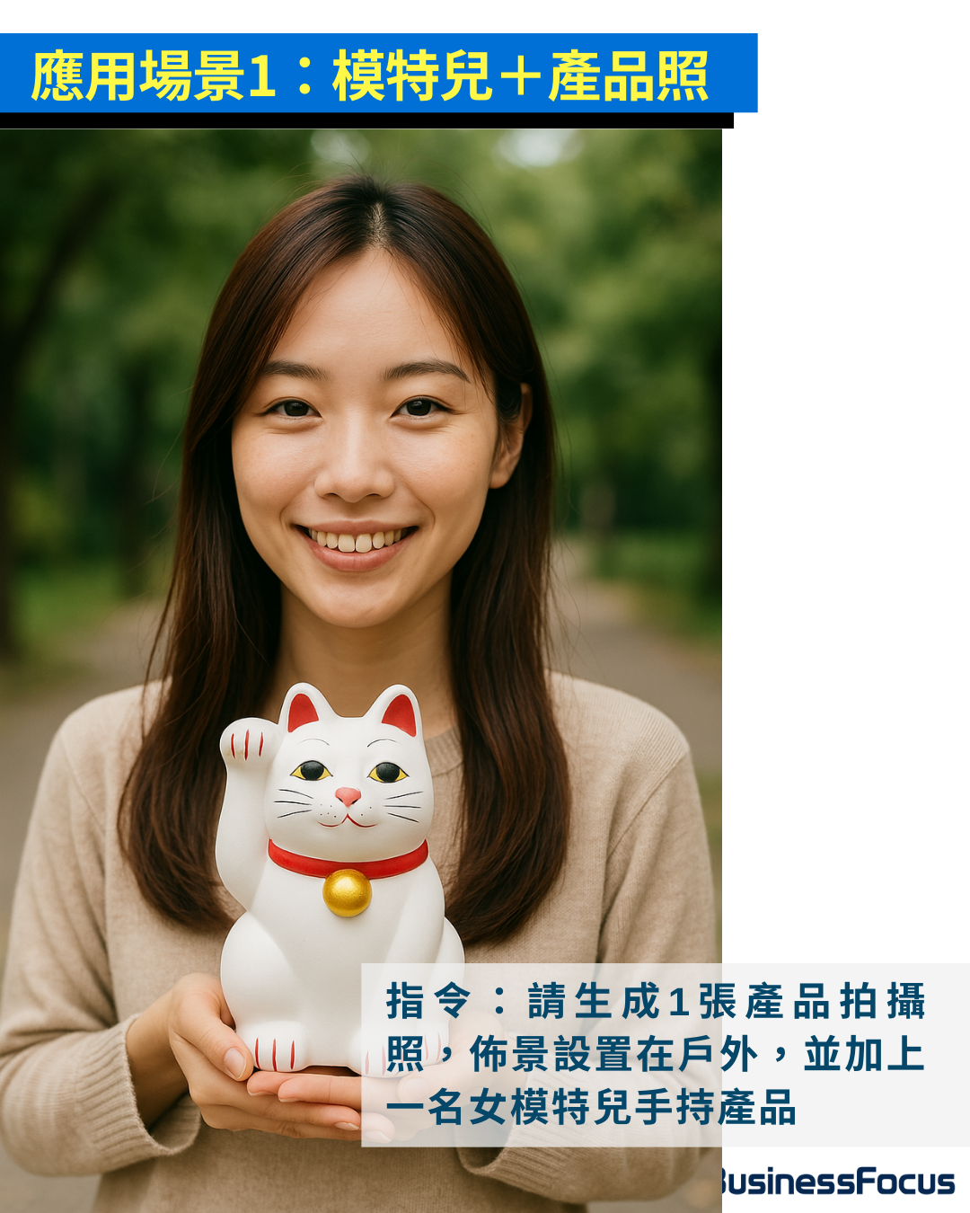 在行銷時,往往品牌需要花上不少時間拍攝產品宣傳照。記者今次實測運用ChatGPT 4o的圖像生成,根據產品描述和風格要求,無論是背景設計、產品細節展示還是與模特的搭配,都能在數分鐘內滿足指令。人像顯示及比例均合理,不過產品則略為不真實,明顯是加工圖片。