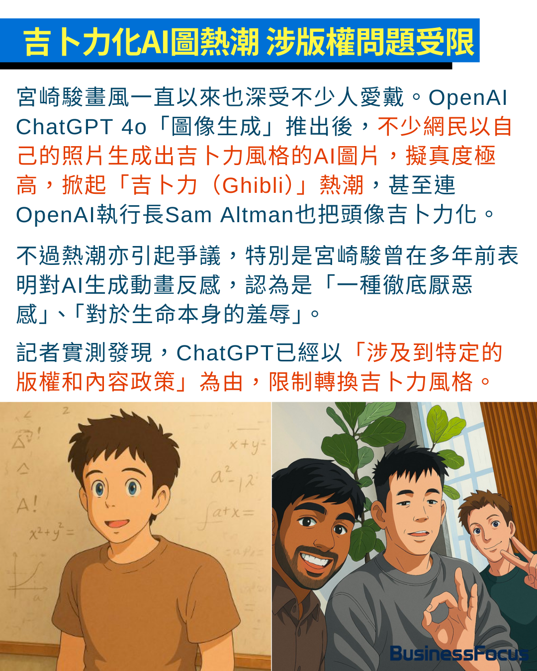 隨著AI技術發展,語言處理和圖像生成的能力逐漸打破傳統創意產業界限。近日,OpenAI的ChatGPT 4o版本推出「圖像生成」功能大熱,隨即引起一陣「吉卜力(Ghibli)」熱潮,惟不足數天已涉版權問題出現限制,無法直接將圖片轉換成吉卜力風格。