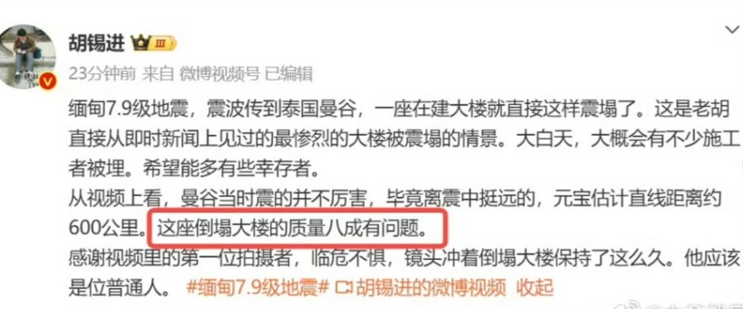 事件並在中國再引發言論審查風波,因地震發生後,《環球時報》前總編輯胡錫進在微博發文,質疑「這座倒塌大樓的質量8成有問題」,又形容塌樓的短片為「老胡從即時新聞上見過的最慘烈的大樓被震塌的情景」。他解釋,曼谷當時震感並不強烈,加上離緬甸震央甚遠,建築卻瞬間崩塌,暗示品質有問題。然而,這篇評論很快在微博下架,僅在觀察者網「風聞社區」等保留紀錄。
