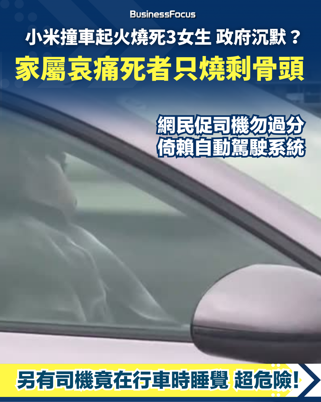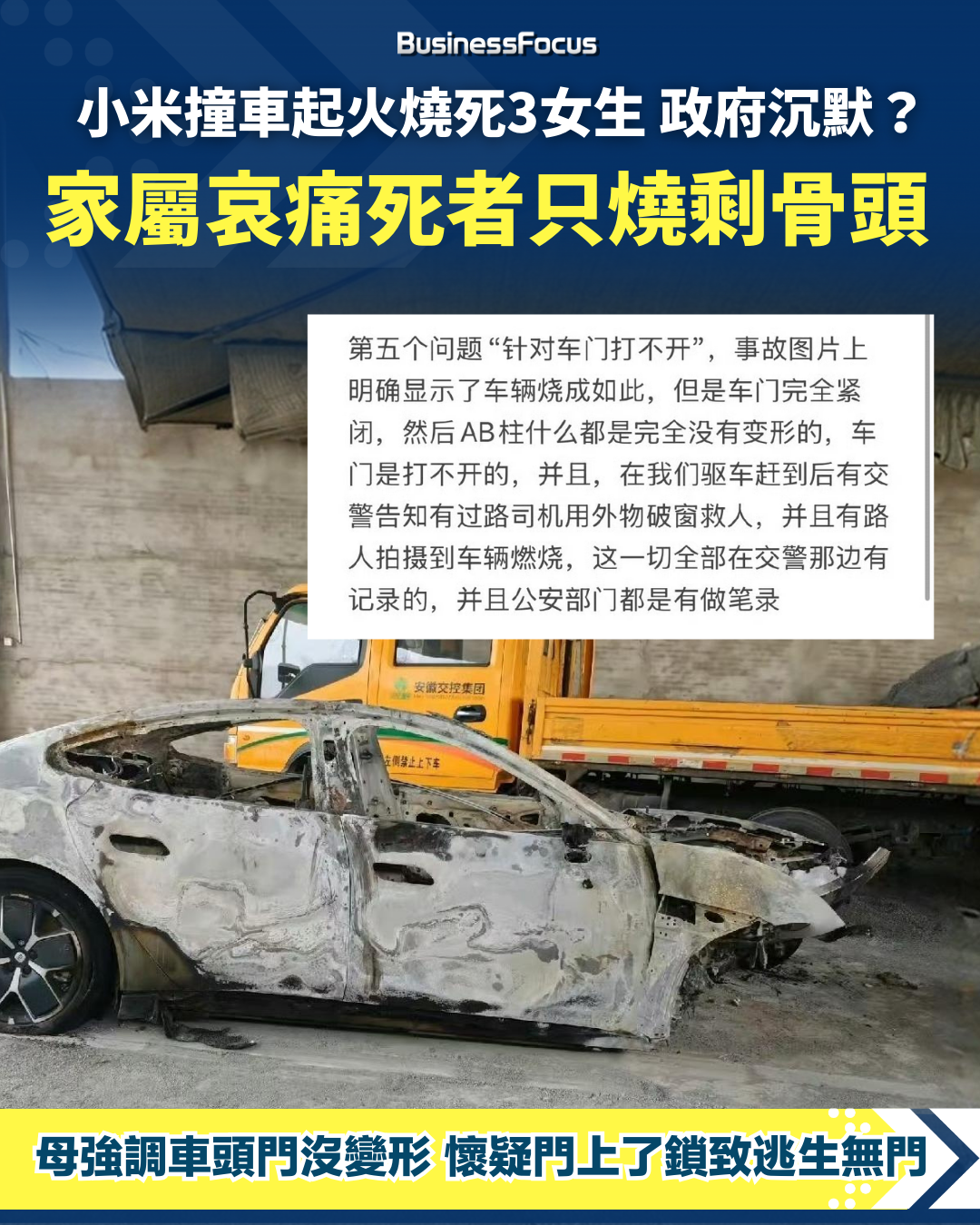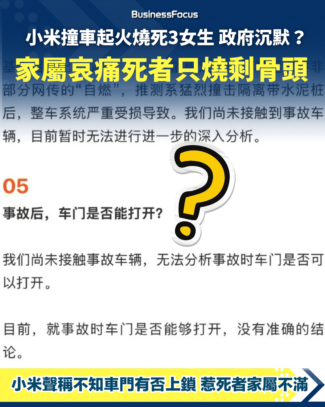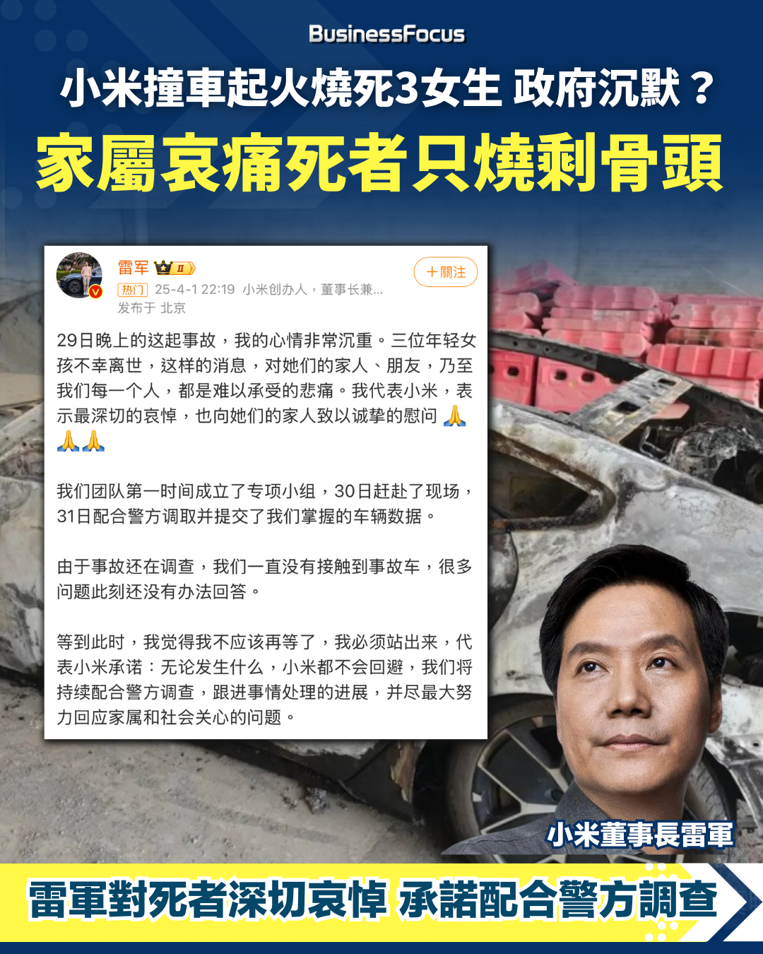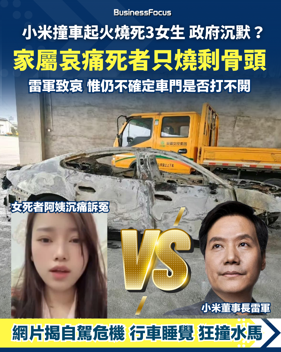 小米(1810)電動車SU7上月29日發生嚴重車禍,它在安徽高速公路以時速近百公里高速撞護欄後起火,車上三名女大學生慘死,家屬慨嘆有死者「燒至只剩骨頭」,並質疑車禍後上鎖的車門無法打開,致3名少女逃生無門,要求小米交代。事隔4天,小米董事長在微博首開腔,指向死者致以最深切哀悼及慰問,強調小米已成立專項小組配合警方調查。不過,小米仍聲稱難確認意外後車門是否真的無法打開。引起網民激辯,爭論慘劇主因究竟是汽車安全有問題,還是司機過分倚賴自動駕駛及大意所導致。