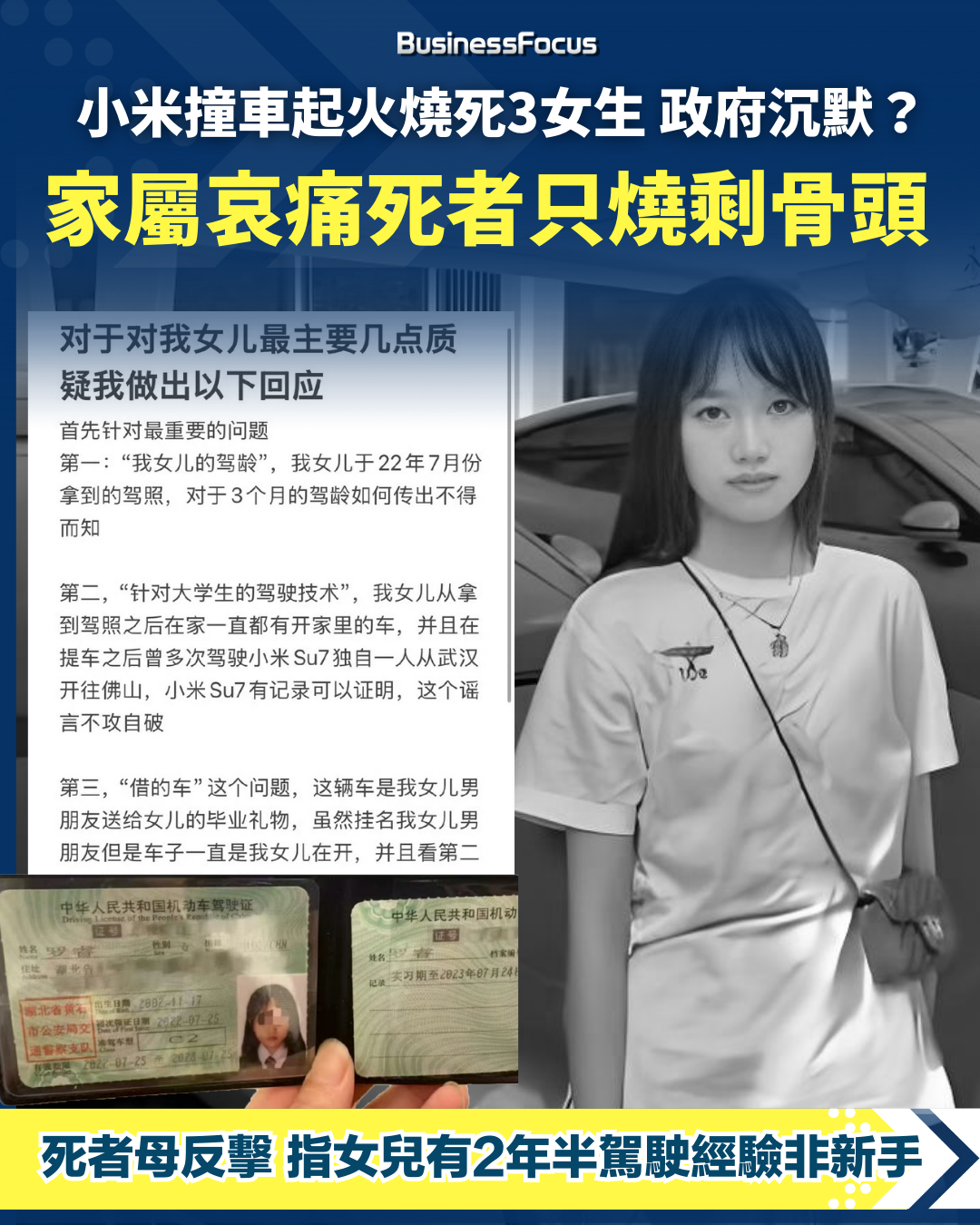 姓羅22歲女司機(大學生)的母親,更勇敢面對網民的質疑,試圖逐點反駁。她首先出示女兒的駕駛執照相片,證實女兒已領取駕照約2年半,絕非網民虛構的「只得3個月駕駛經驗」的初哥;其二是她承認女兒駕駛的小米SU7是女兒男朋友送的禮物,但她強調絕無問題,因其女兒曾在長途旅行中駕駛此電動車,駕駛經驗絕對足夠。