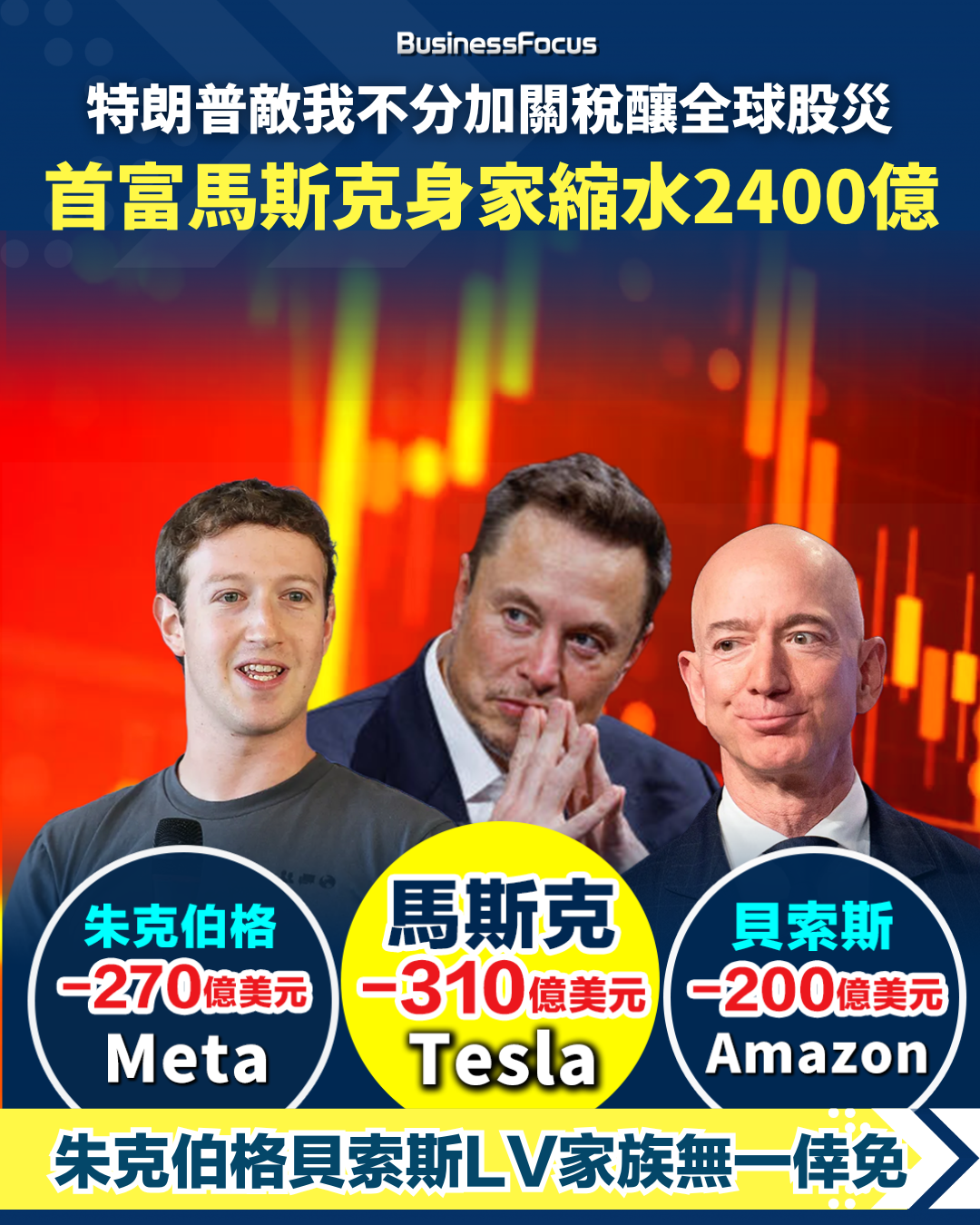 股市暴跌令全球富豪財富大幅縮水。根據彭博億萬富豪指數,全球500大富豪身家在過去兩日合共蒸發5360億美元,近90%富豪財富縮水,平均跌幅達3.5%。其中,特斯拉及SpaceX創辦人馬斯克(Elon Musk)損失最為慘重,兩日身家銳減310億美元(約2418億港元),令其年初至今累計損失擴大至1300億美元,幾乎抹去過去兩年的財富增長。
