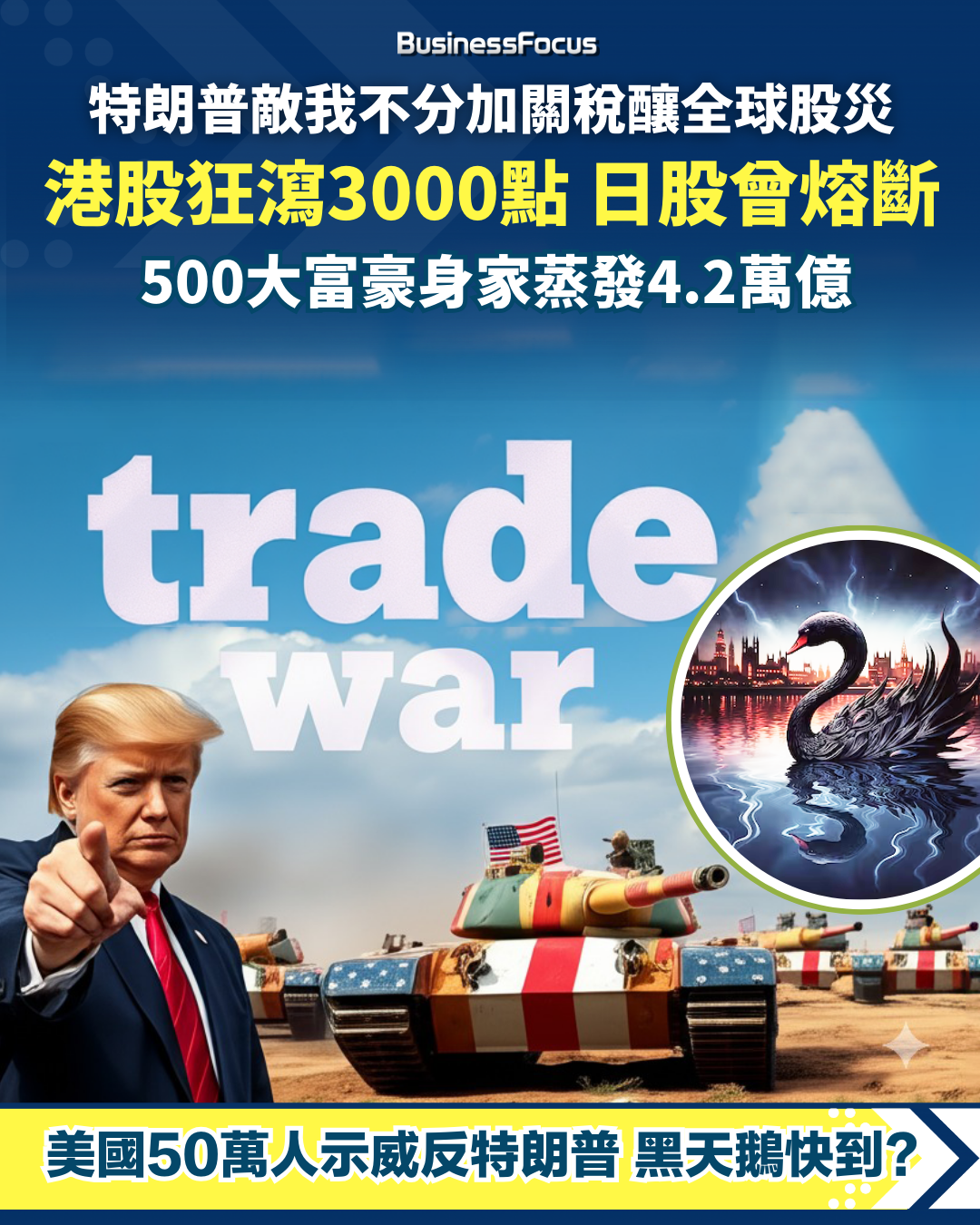 特朗普敵我不分加關稅釀全球股災 港股狂瀉3000點 500大富豪身家蒸發4.2萬億 50萬人示威反對朗普