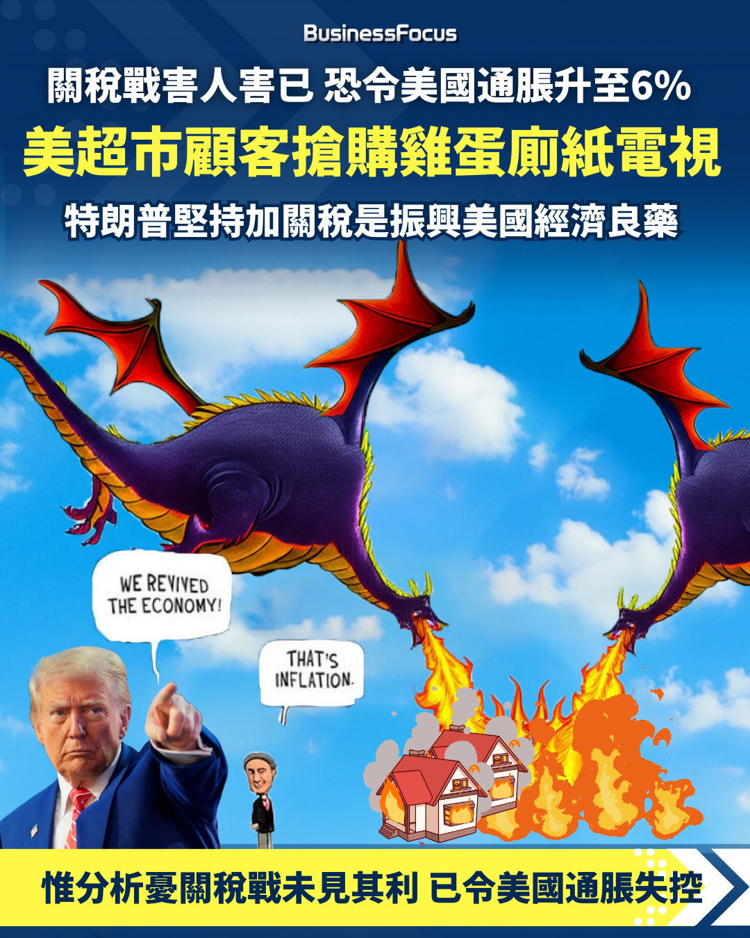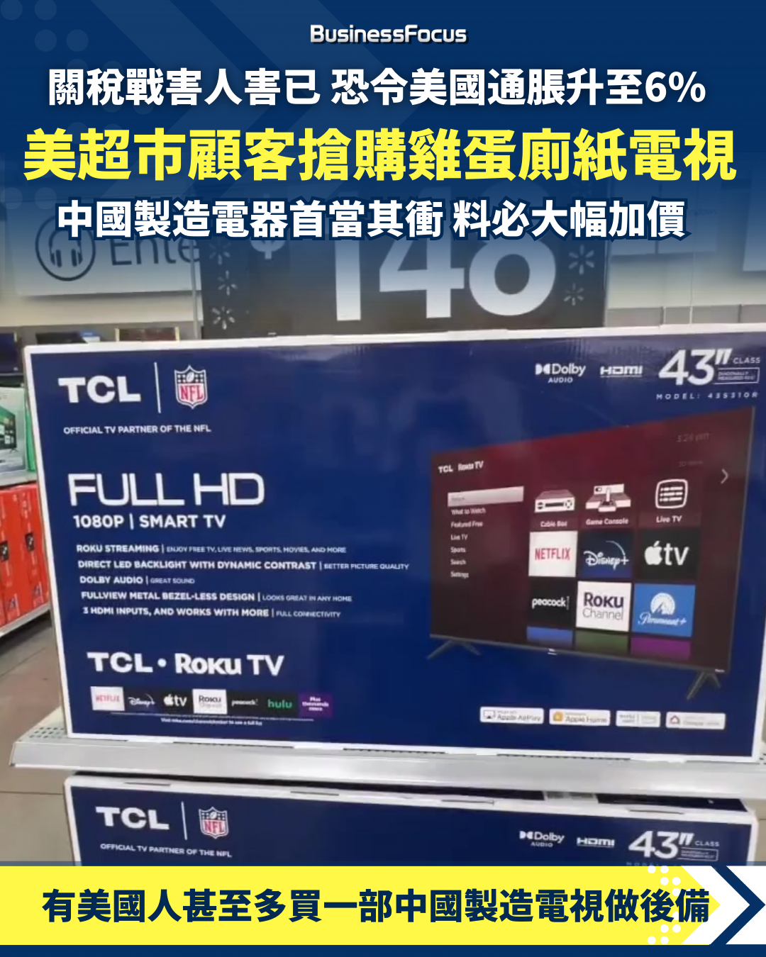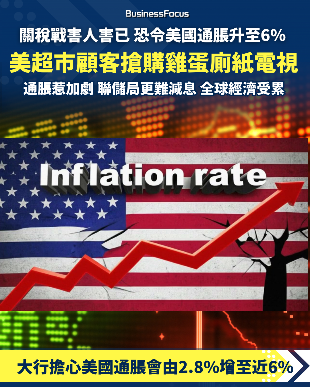 美國通脹率現時約為2.8%,但專家警告,若超高關稅落實,美國通脹有可能升至接近6%。據報道,美國基層市民出於對物價暴漲的恐慌,近日紛紛湧到超市掃貨,故由電視、洗衣機到廁紙、洗髮水甚至雞蛋都熱賣,部分熱門貨品貨架被清空。據報道,部分中國製造的家電價格更已「偷步」上漲兩至三成。
