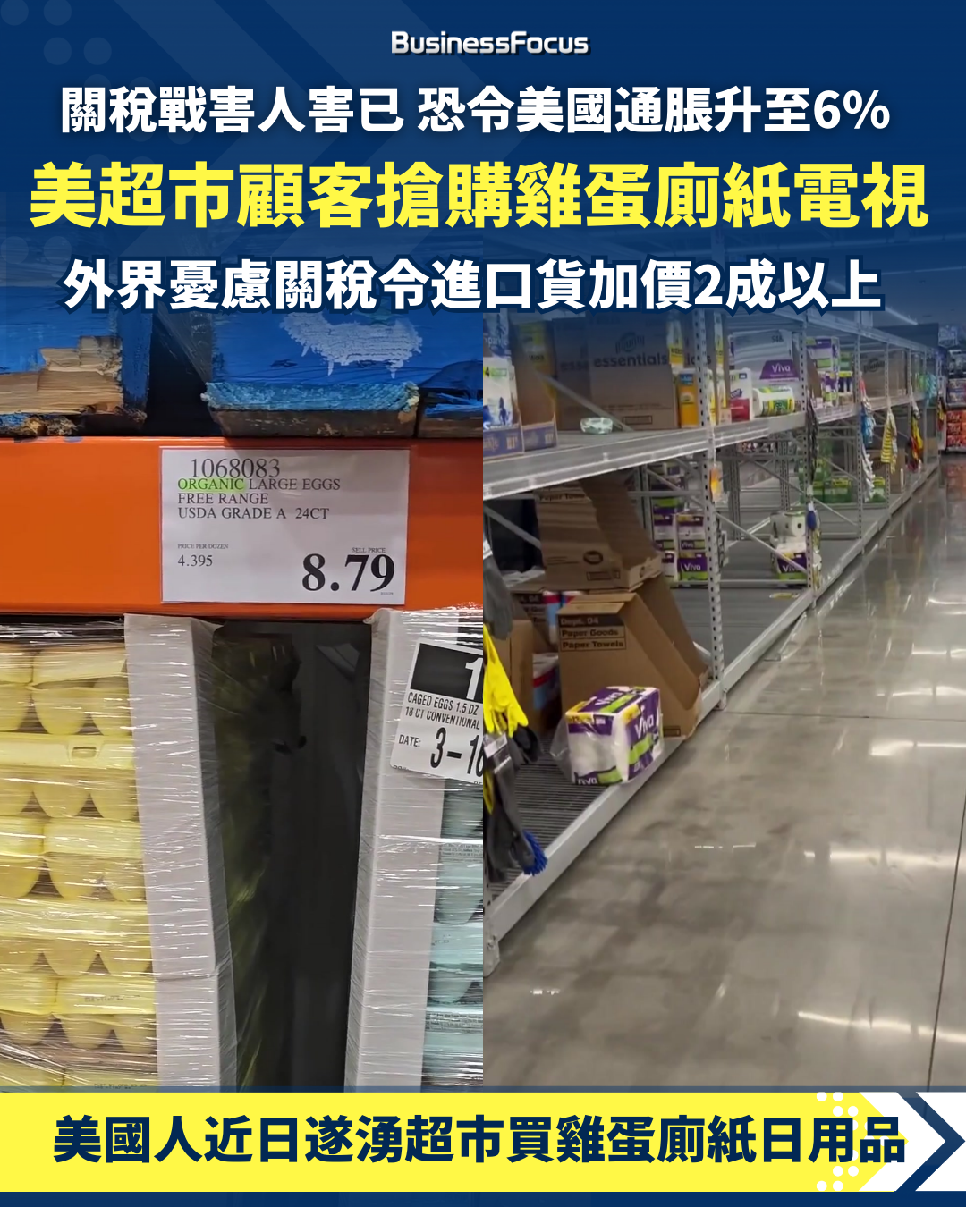 關稅戰恐令美國通脹升至6% 美超市顧客搶購雞蛋廁紙電視