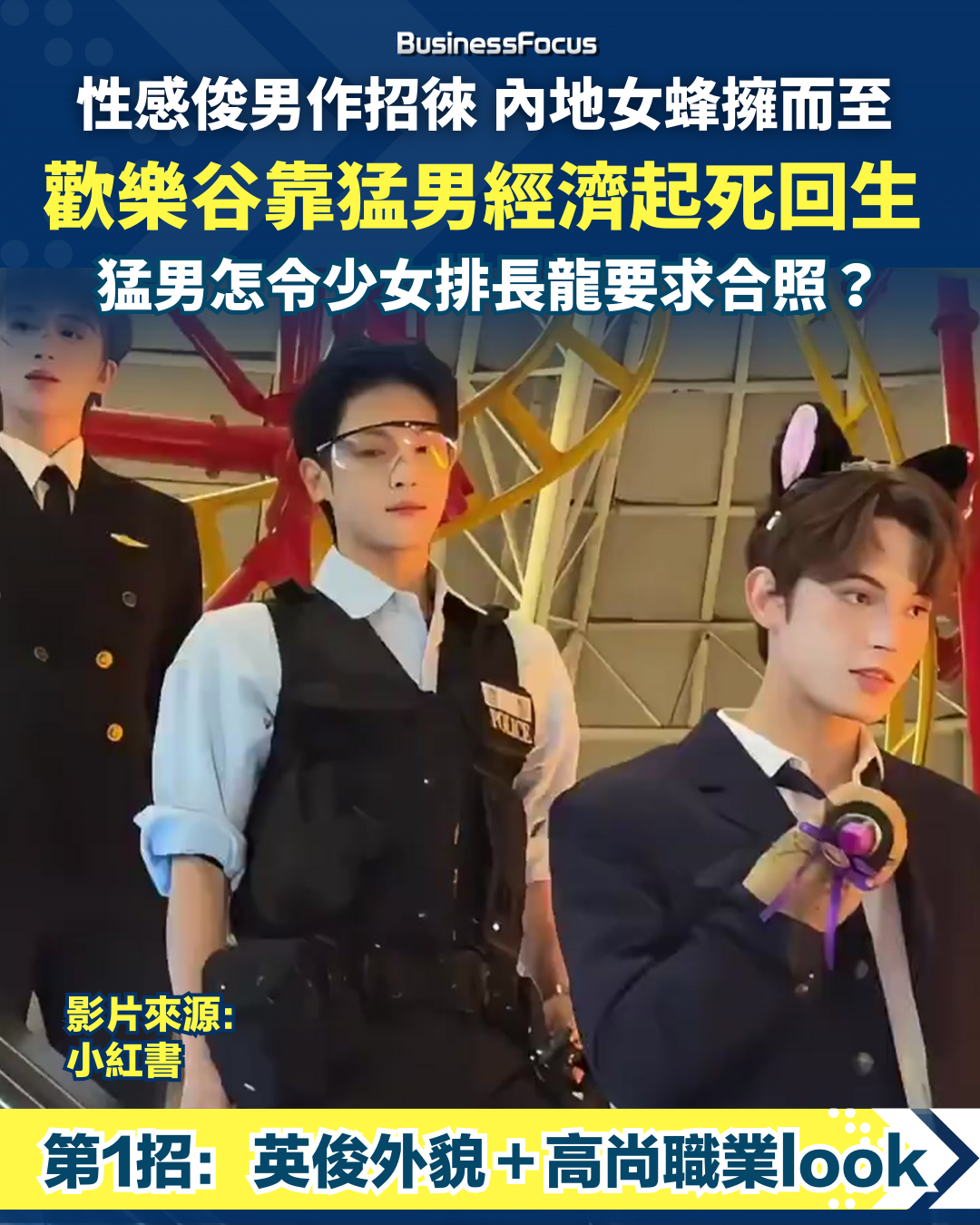 中港經濟不景,遊樂園生意難做,但曾因嚴重過山車意外致遭整改的內地「歡樂谷」,過去一年卻憑著「猛男經濟」大復活,入場人數及收入均從谷底大反彈。綜合內媒報道,「歡樂谷」破釜沉舟聘用大量俊男及猛男,以3招包括性感俊朗造型、高貴但親民的服裝及人設以及「公主抱」,俘虜了大量女消費者入場做「忠粉」。在內地大節日,甚至出現了入場的少女為了與英俊猛男合照「打卡」,不惜苦排兩、三個小時的奇景,成功在國內每年達10萬億人民幣(約10.6萬億港元)的女性消費市場分一杯羹。