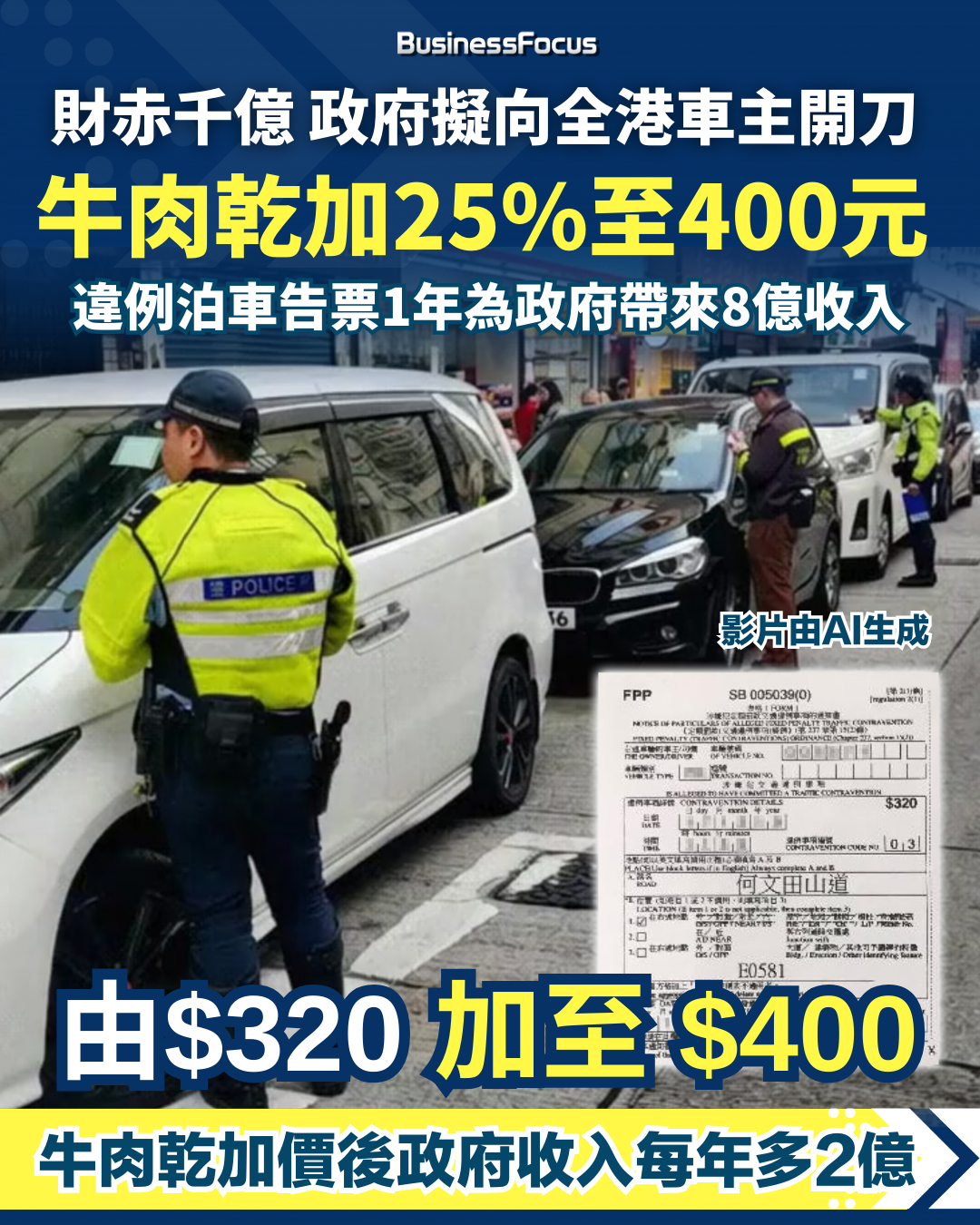 綜合傳媒報道,運輸及物流局建議把交通違例罰款、咪表收費、電動私家車牌照費一併加價,並將於下周五(4月25日)在立法會交通事務委員會會議上公布及討論具體安排,冀年內完成修訂。消息稱,政府打算把違例泊車定額罰款告票(俗稱「牛肉乾」)由320元增加25%至400元,並認為加幅合理,因為相關罰款已經30年未有調整,期間香港累計通脹率達7成。