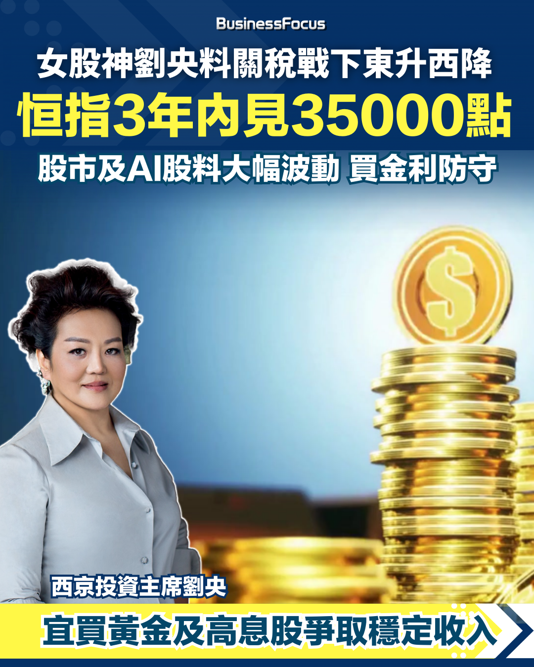 繼沈大師多年前預測「港股4萬點」後,有中國女股神之稱的劉央亦預計,港股在2027年或之前有望高見35,000點!劉央指雖然美國發動關稅戰影響全球,恒指今年難突破25,000點,但她相信最終會「東升西降」,長遠對港股有利。劉央預期AI熱潮下港股會陸續出現獨角獸新公司,形成「H7(港股科技七雄)」,又堅信騰訊(0700)有機會跑出,股價將倍升至1,000元。但為減低風險,她認為散戶投資組合內除了AI應用股,亦應該同時有黃金及穩健高息股。