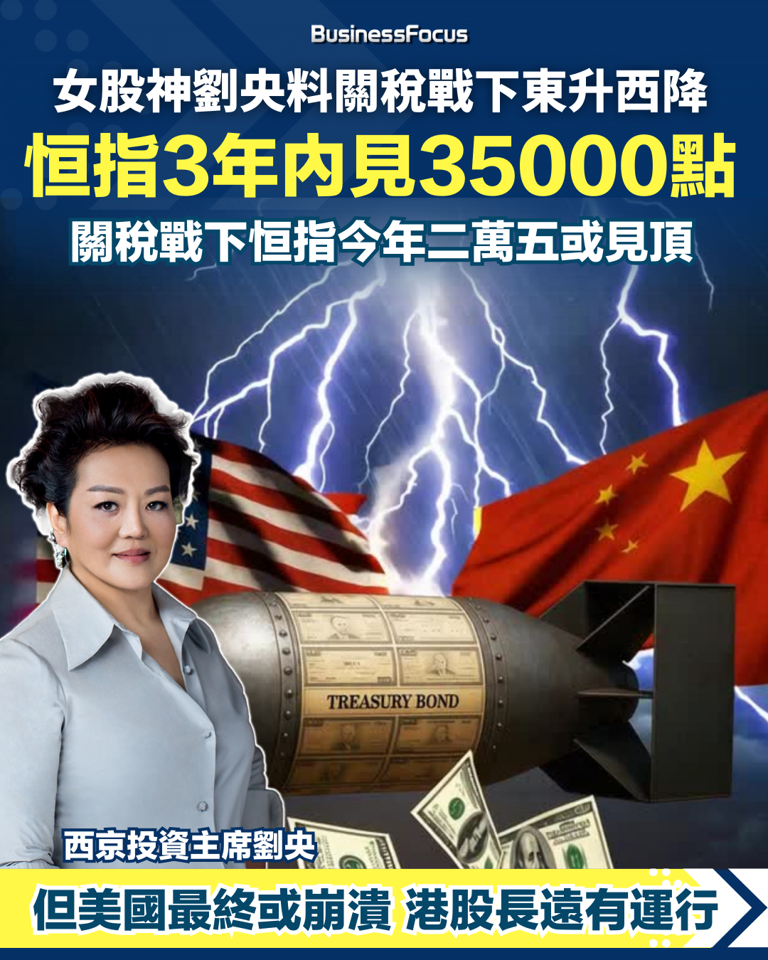 為何會有這種看法?劉央解釋,美國總統特朗普正進行一場史無前例的革命,向全球大加關稅,這會撼動金融以至政治制度。若特朗普仍當權,有關的經濟震盪恐只會加劇,未來難以預測。但她認為這對香港而言反而是機會,因為她相信「美國的一套」有機會漸崩潰。故會出現東升西降,對香港股市有利。尤其是市場正逐步認可中國的高科技產品(及服務),港股料因為政治穩定及背靠祖國而可以受惠。