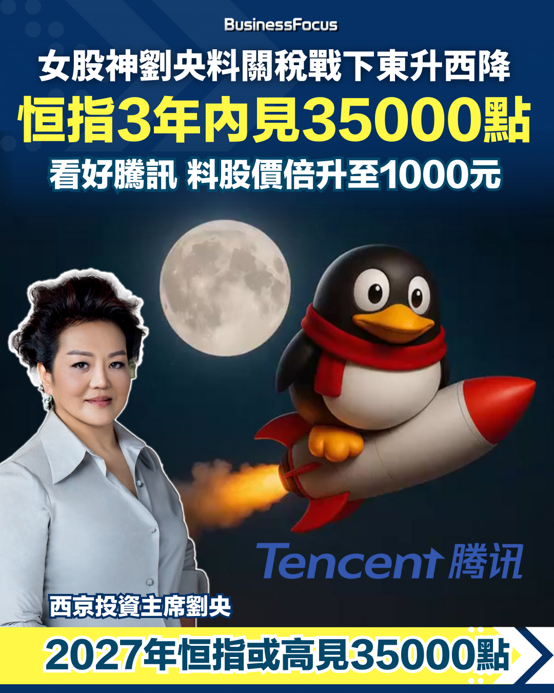女股神劉央料恒指3年內見35000點 看好AI黃金 料騰訊可升至千元