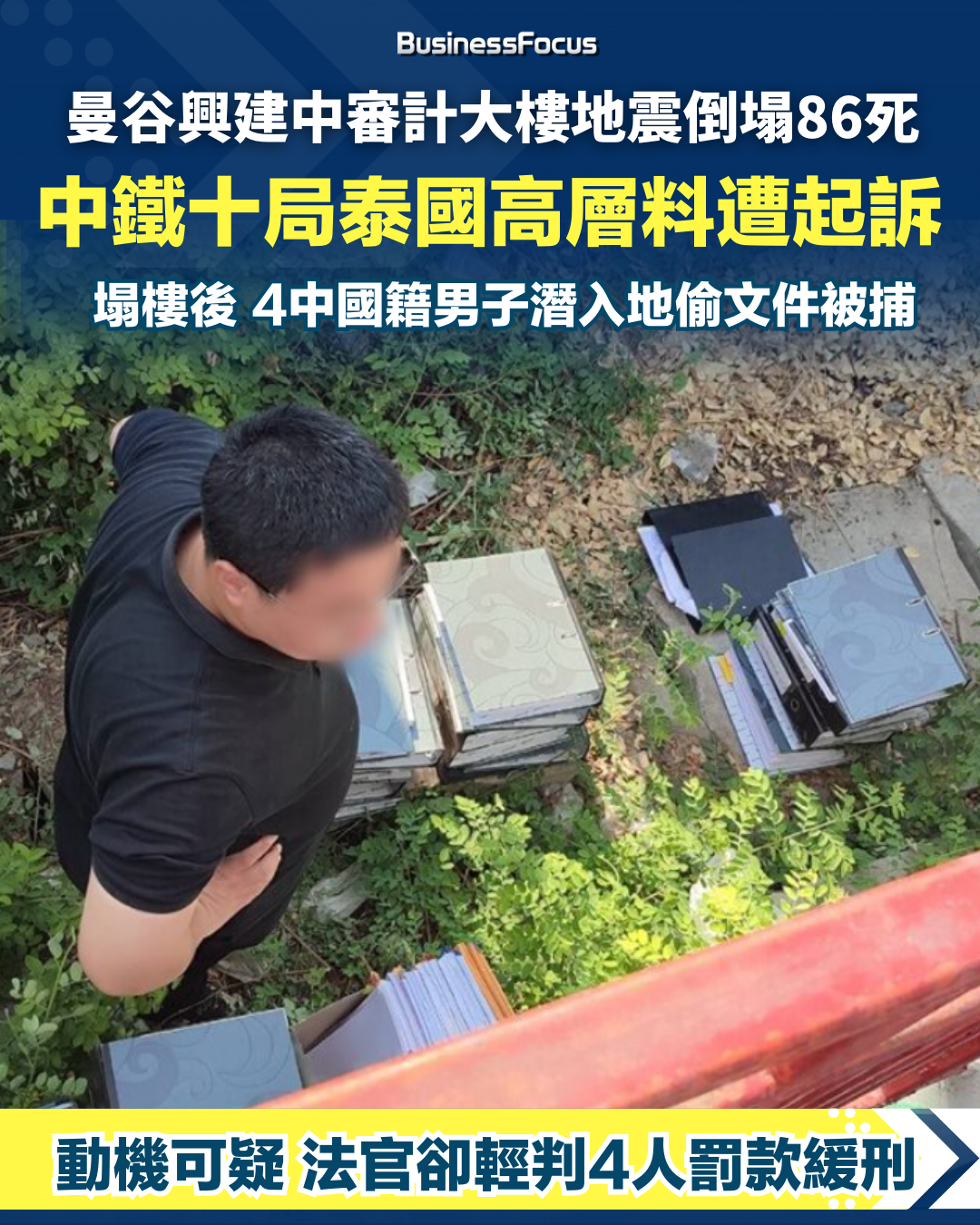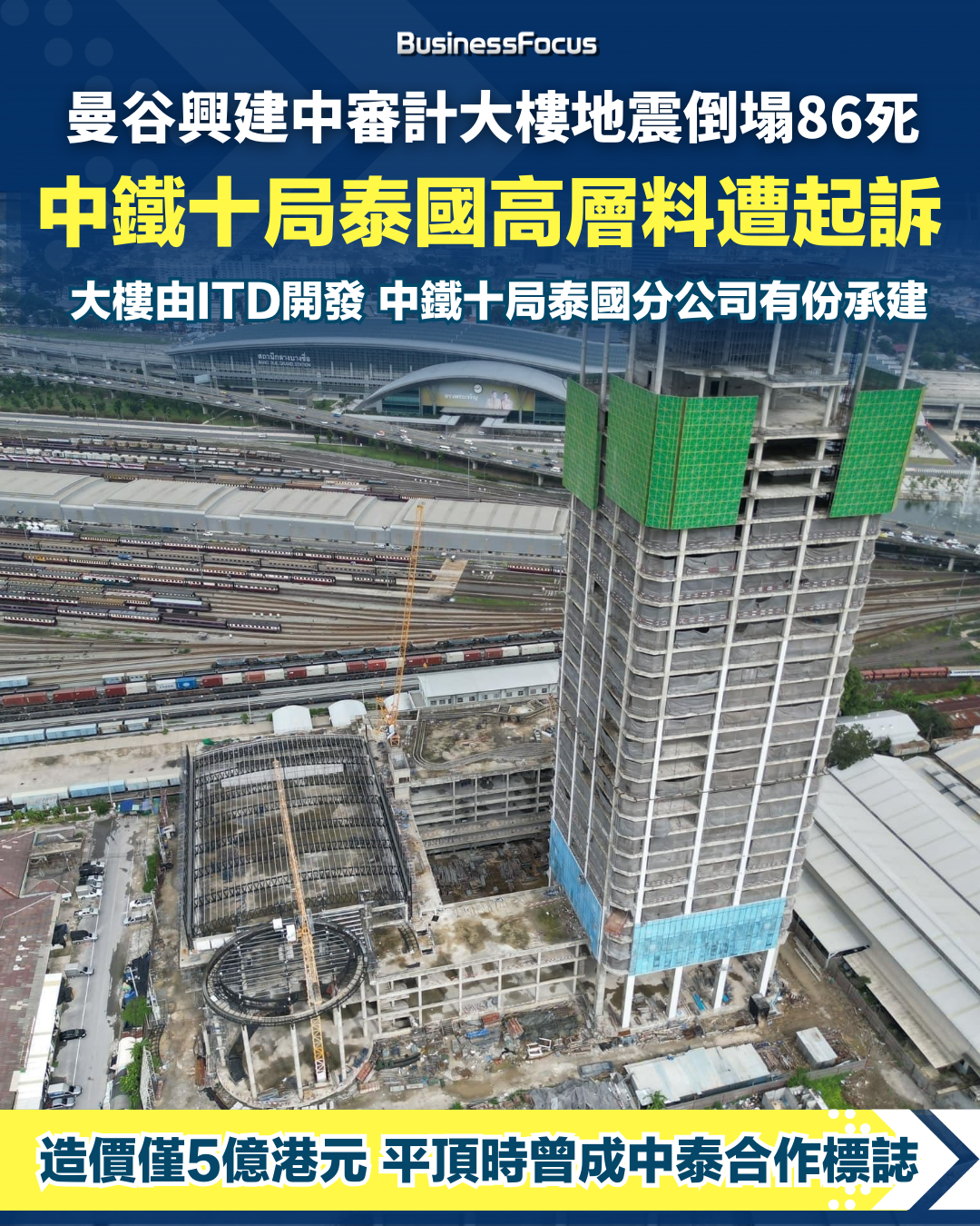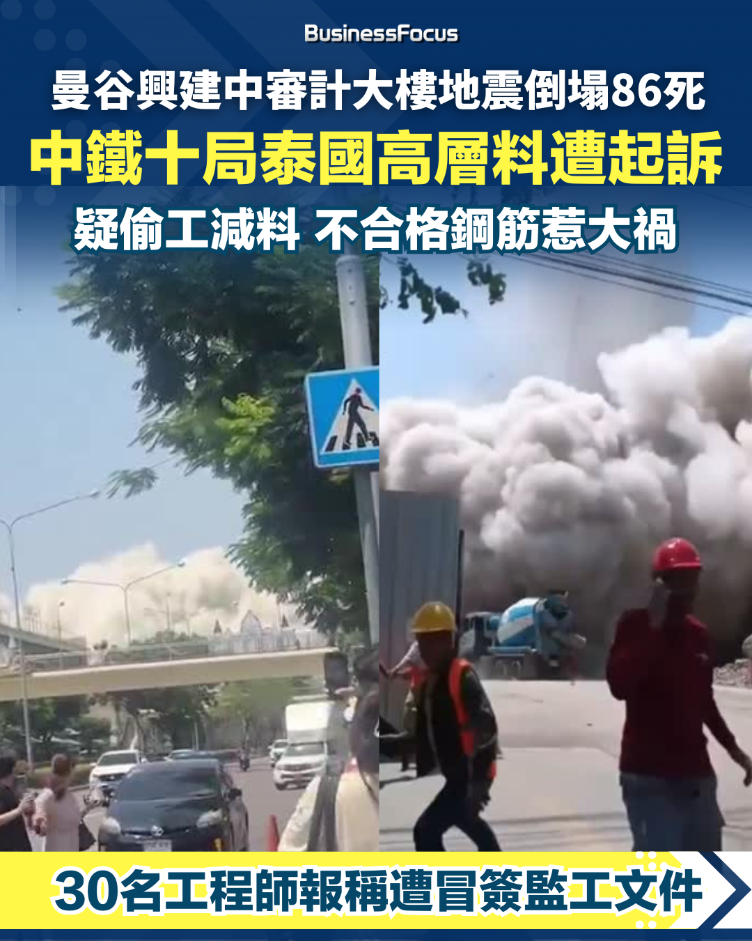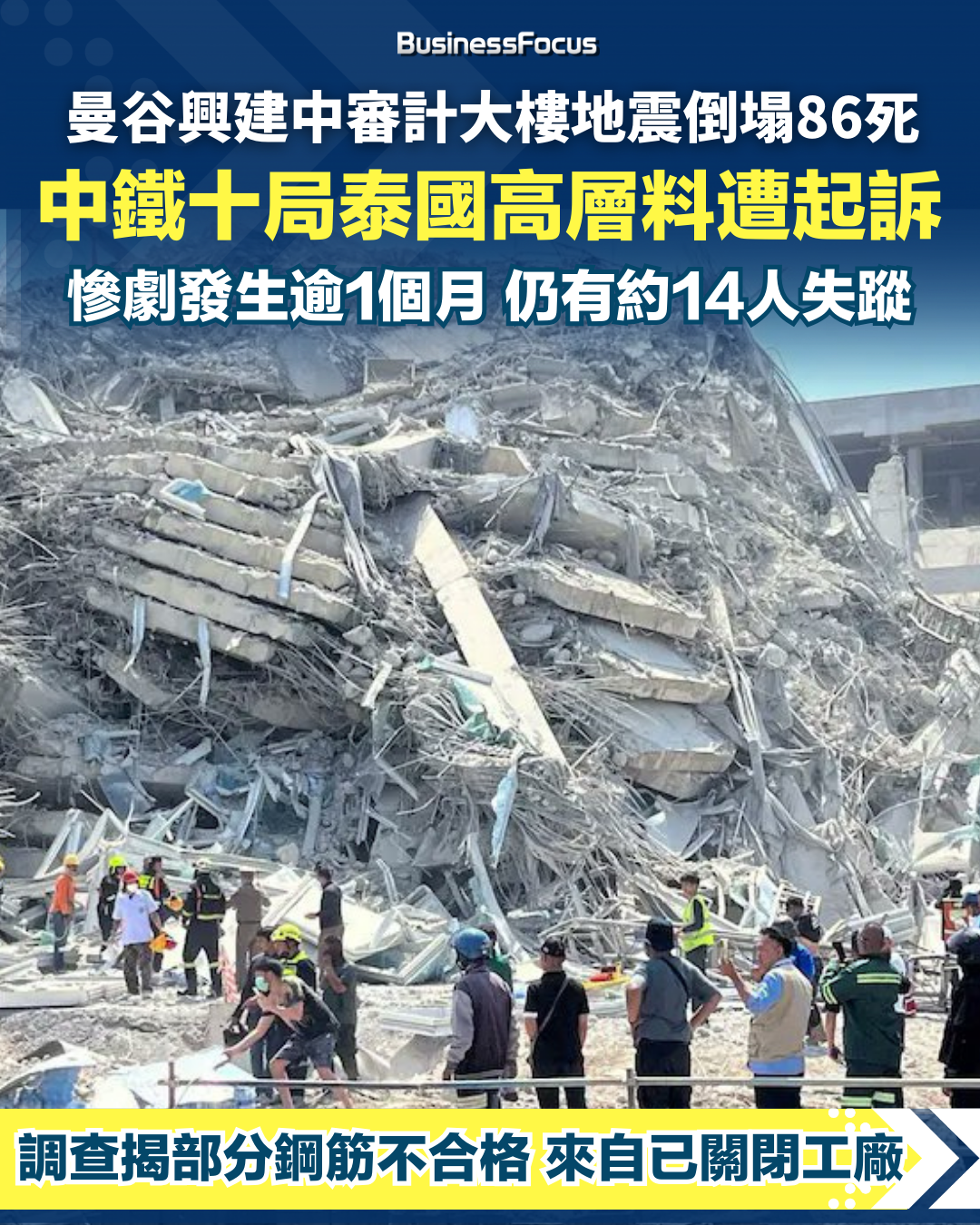 緬甸3月28日發生7.9級大地震,令千里之外的泰國曼谷興建中的30層政府審計大樓倒塌,造成86死9傷以及14人失蹤。據泰媒報道,泰國當局懷疑大樓偷工減料、鋼筋強度不合格,甚至有人冒認多名工程師簽名,更涉嫌擅自更改大廈設計,終造成慘劇。有份承建大樓的中國國企中鐵十局泰國分公司的總經理張傳令及3名泰國疑似掛名股東上月已被拘捕,泰國當局擬向4人率先作出檢控。