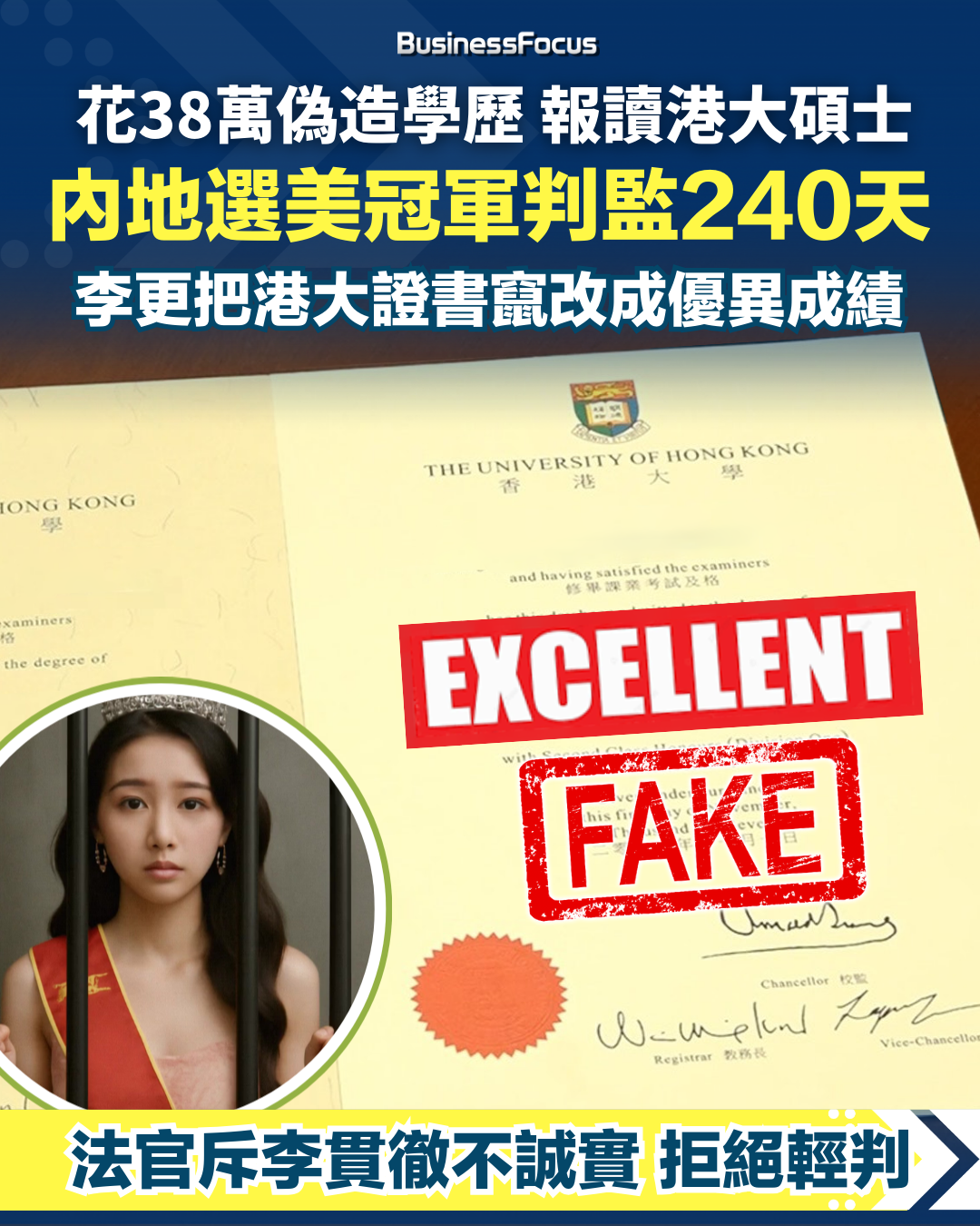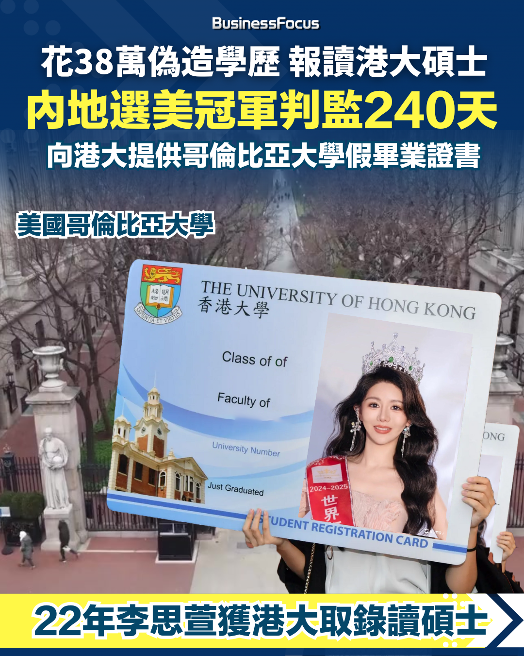 內地選美冠軍李思萱花38萬偽造美國學歷 報讀港大碩士 判監240天