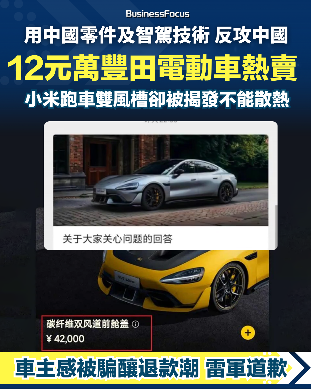 中國的電動車市場原以比亞迪(1211)一枝獨秀,加上其他中國車企,以及雷軍的小米(1810)最新研發的熱賣電動車,原令日本及德國等外國電動車在中國市場受極大壓力。不過小米近日屢屢受挫,首先是早前有小米電動車在自動駕駛期間高速撞欄後起火燒死車內3少女,至上周小米推出的高階SU7 Ultra電動車又被揭發,車主要花4.2萬人民幣才能加裝的配件「碳纖維雙風道前艙蓋」,原來涉嫌造假。