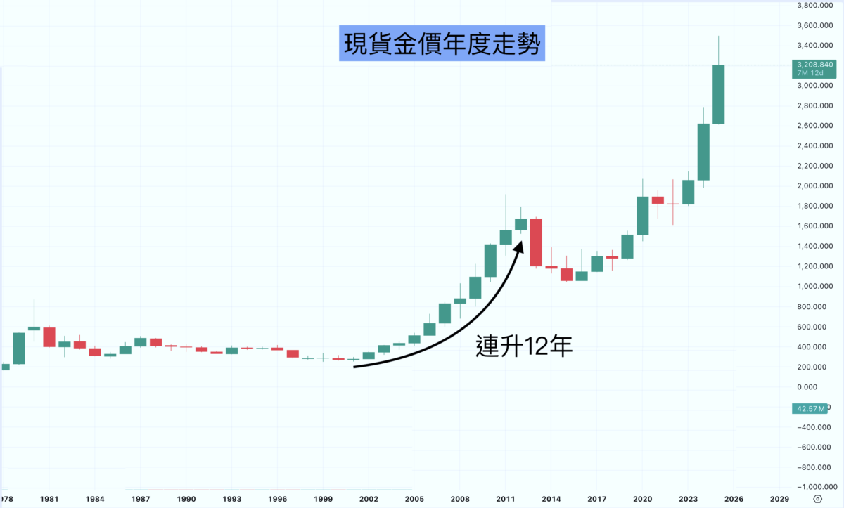 由1999年最低位計起,升浪持續了13年,如果按年度收盤計,底部則在2000年,升浪也持續12年(連續12個年收盤高於開盤)。本輪黃金牛市始於2023年,經歷2021及2022的兩年調整,金價從1810美元升至今天超過3000美元,如果此輪牛市也如上個周期般超過10年,金價可以升到你無法想像,3500美元只是一個中途部,好戲還在後頭!