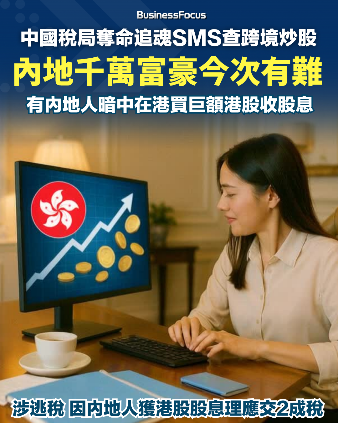 內地富人近年流行「偷運」資金來港買股、買保險,買樓,既可逃稅又可轉移資產,但他們或者快將「大難臨頭」?據報道,中國稅務總局近月大舉出手,透過香港券商經「共同匯報準則(CRS)」間接呈交的內地客人資料,向一批在香港股票戶口擁逾100萬美元資產的內地人發出「奪命追魂SMS」。該SMS(短訊)要求對方補充過去3年的境外投資收益及補交拖欠的稅款。其中內地人藉港股收取的股息,必須補交2成欠稅;有傳在港買賣港股美股若獲巨利,亦有可能要補交所得稅,惹來議論紛紛。