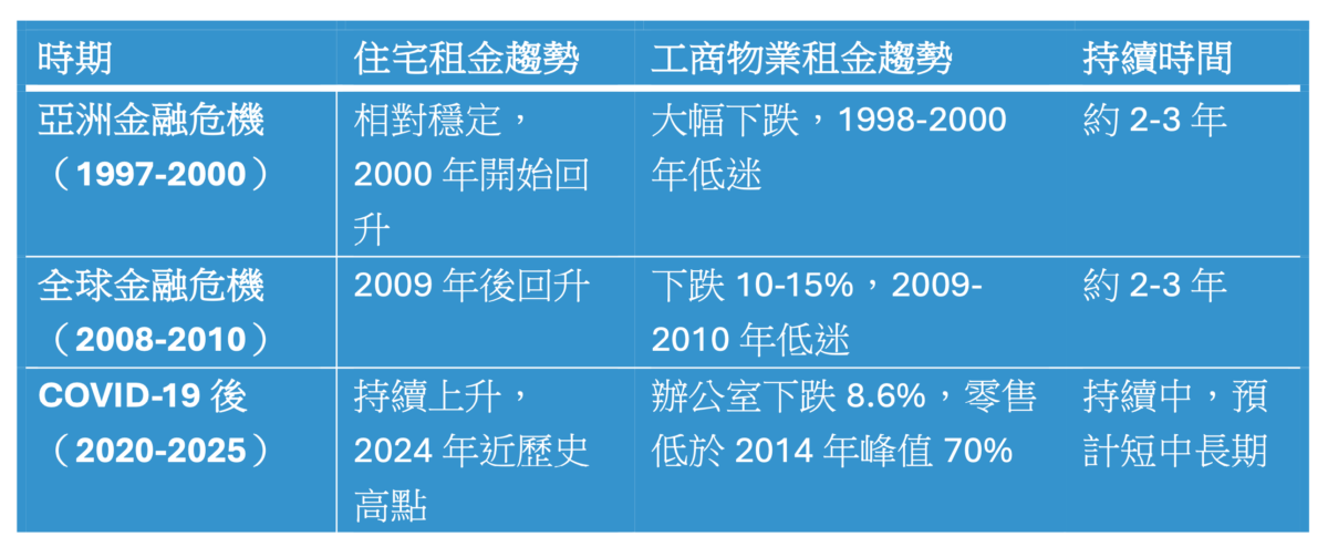研究顯示,住宅租金上升而工商舖租金下跌的現象通常與經濟週期相關,歷史數據顯示這一趨勢在過去危機期間出現,並在經濟復甦後調整。例如,1997年和2008年的分化持續2-3年,隨後市場回暖。