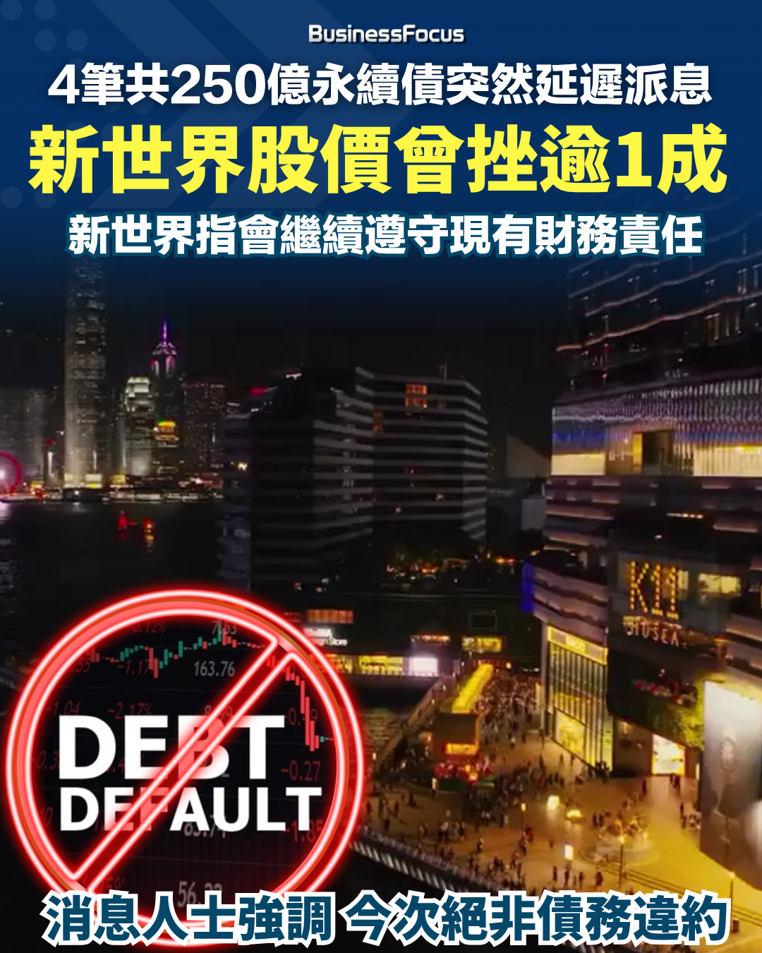消息人則士強調,今次新世界絕非債務違約,因永續債條款是容許延遲派息,外界不用擔心。新世界發言人亦表示,考慮到現時市場波動的同時,公司持續管理其整體財務債務,並會繼續遵守其現有財務責任。