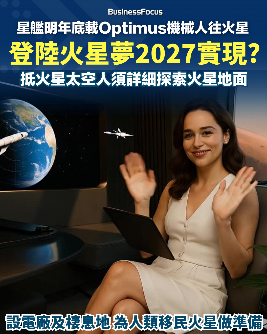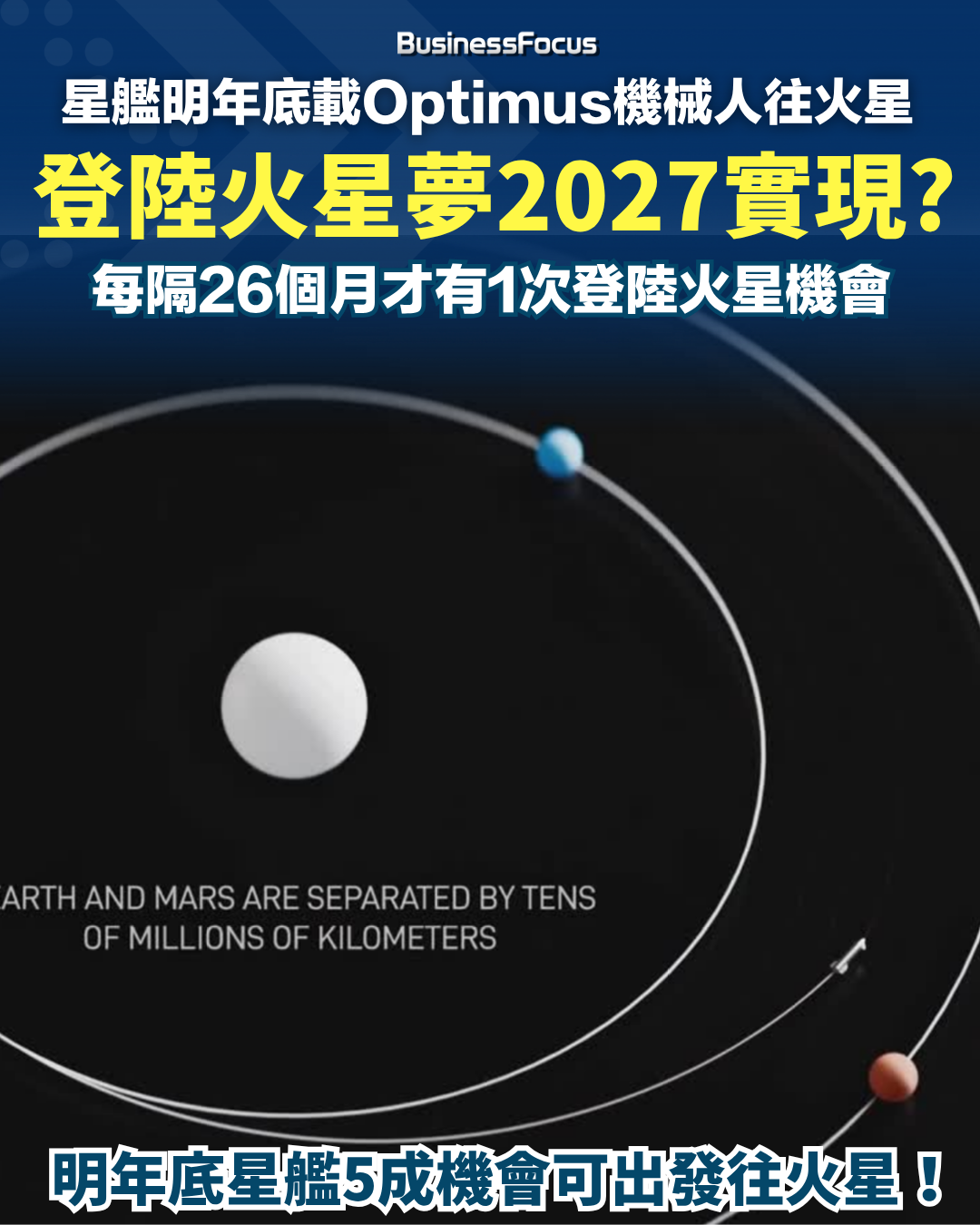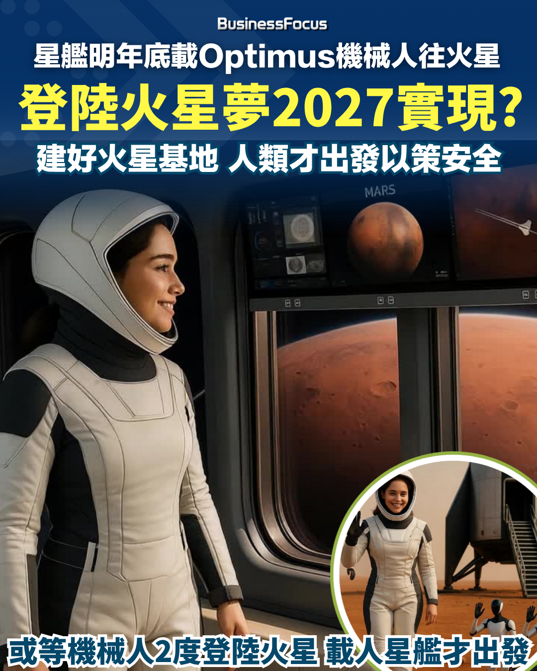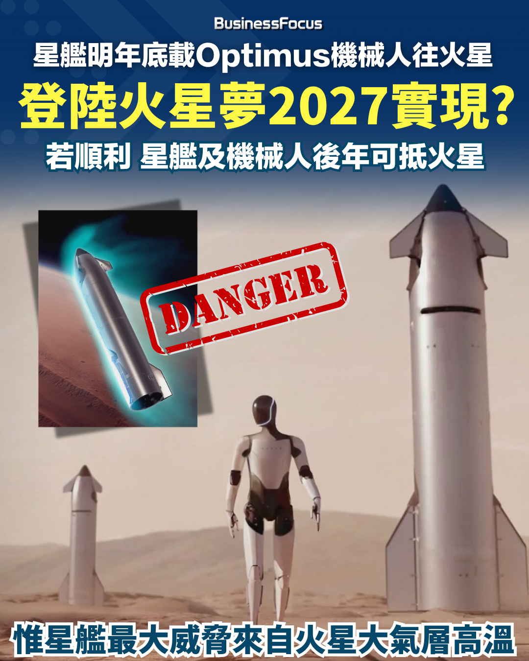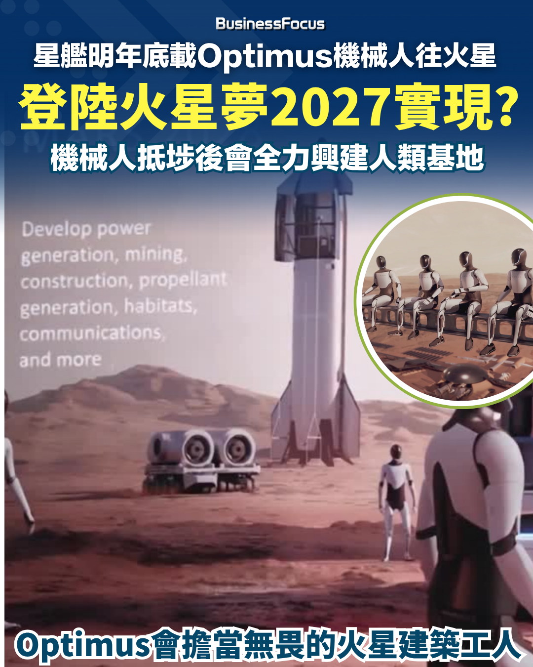 人類徹底探索火星的夢想,可憑著AI機械人在2027年實現?全球首富馬斯克宣布將離開特朗普政府後,全力發展他的「千艦齊發」征服火星大計。他透露他創辦的SpaceX的新型星艦(Starship)火箭,最快可以明年即2026年底出發往火星,成功出發機會有5成,屆時無人星艦會載著Tesla的Optimus機械人,料2027年可登陸火星。若一切順利,AI機械人將在火星的惡劣環境建設基地,以助達成人類永久移居火星的夢想!