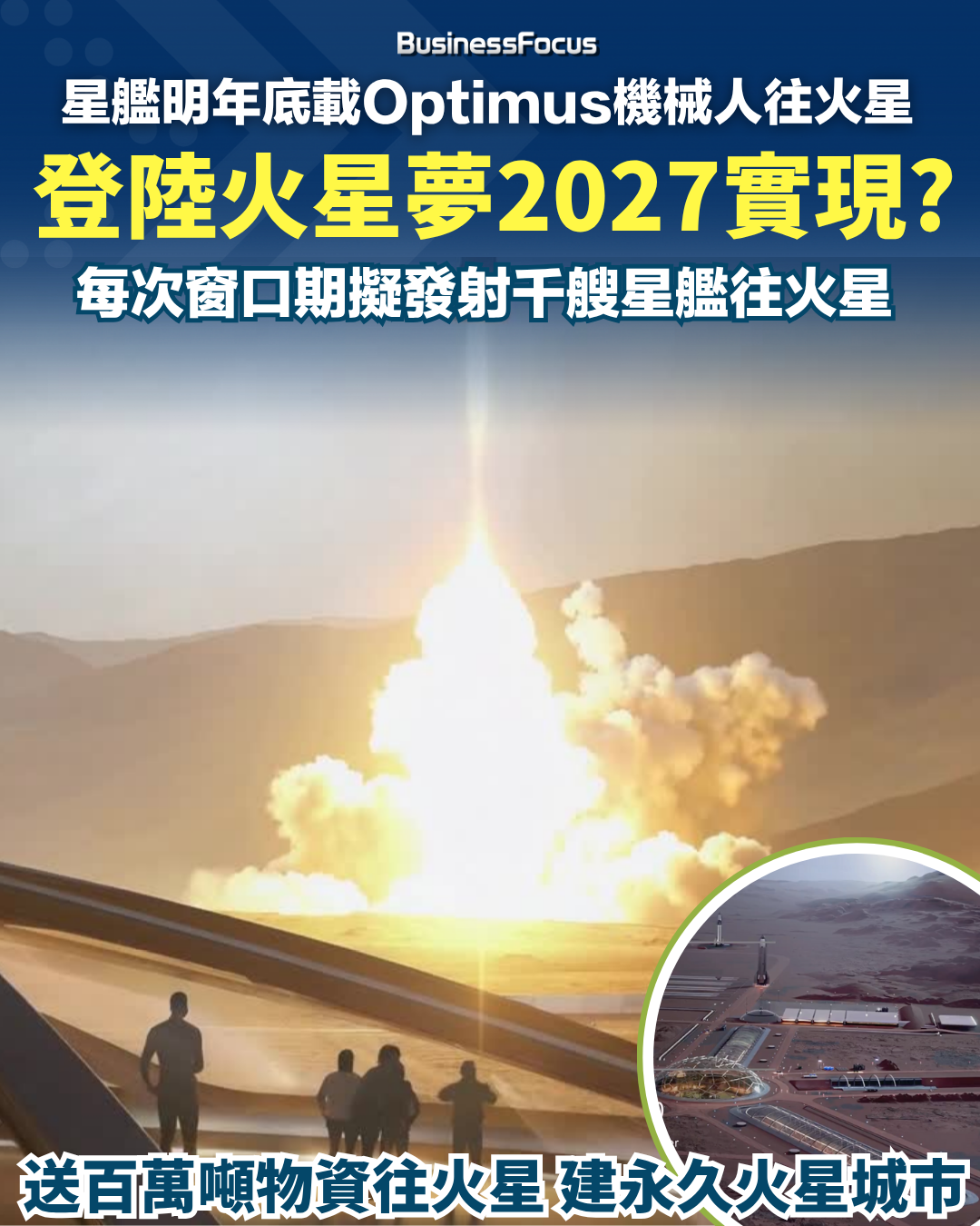 馬斯克更透露他最終目標是在火星建立大型城市,讓人類可永久移居當地,以便日後當地球出現巨大災難時,可成為拯救地球的後盾。但要達成這宇宙之夢,馬斯克指要在每26個月出現一次的「窗口期」,即是由地球出發往火星的合適日子,要發射千艘星艦,以運逾百萬噸物資往火星建造城市,從中可見馬斯克野心之大。