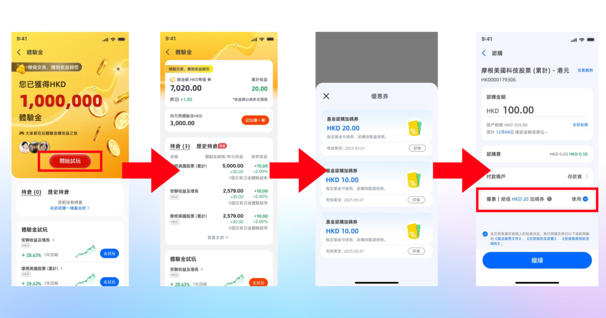 *體驗金是隨機獲取的, 體驗金的投資決策由用户基於自身需求及風險承受能力自主作出。體驗金是虛構的,並無現金價值。所有用體驗金的基金交易均為虛構性質,不涉及任何投資基金產品的實際認購或贖回操作。使用體驗金所獲得的模擬交易利潤將以券形式發放,詳情請參閱活動條款及細則。