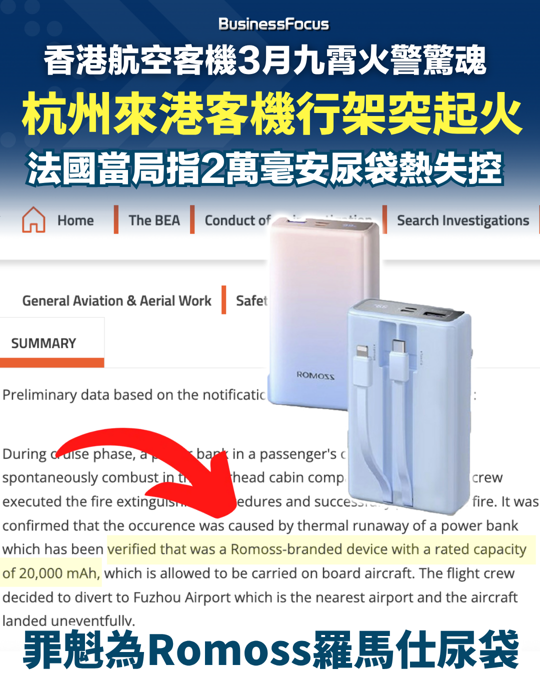 其實事發當日,已盛傳起火原因是行李架內的尿袋自燃。網上公開的法國航空事故調查局調查結果亦顯示,起火的罪魁是一部屬於ROMOSS(羅馬仕品牌)、容量為20000毫安的行動電源(尿袋)。調查指它在香港航空HX115杭州飛香港航班上因熱失控而起火。羅馬仕創立於 2012 年,總部設於中國深圳,自稱為國家高新技術企業,主力發展流動電源、戶外電源、充電線等產品,年出貨量超過 5000 萬件,聲稱全球服務用戶數逾一億人。