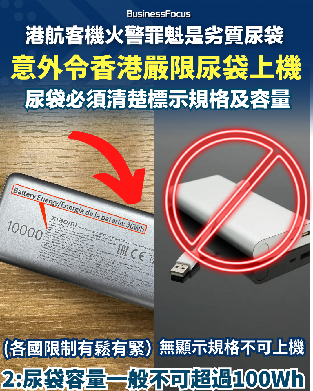 此外,不少國家亦陸續規定,乘客攜帶上機的尿袋,必須要清楚標示其規格包括電容量,尤其是要列明電池的「瓦時」Wh數值大小,否則尿袋不准上機。按照國際航空運輸協會(IATA)規定,大部份航空公司均限制乘客不可攜帶電容量在160 瓦時(Watt hour、Wh)以上的大型鋰電池上機;個別航空公司更要求跟身上機的尿袋電容量不可大於100瓦時。故市民出發外遊前,宜先了解清楚外遊國家的相關限制。