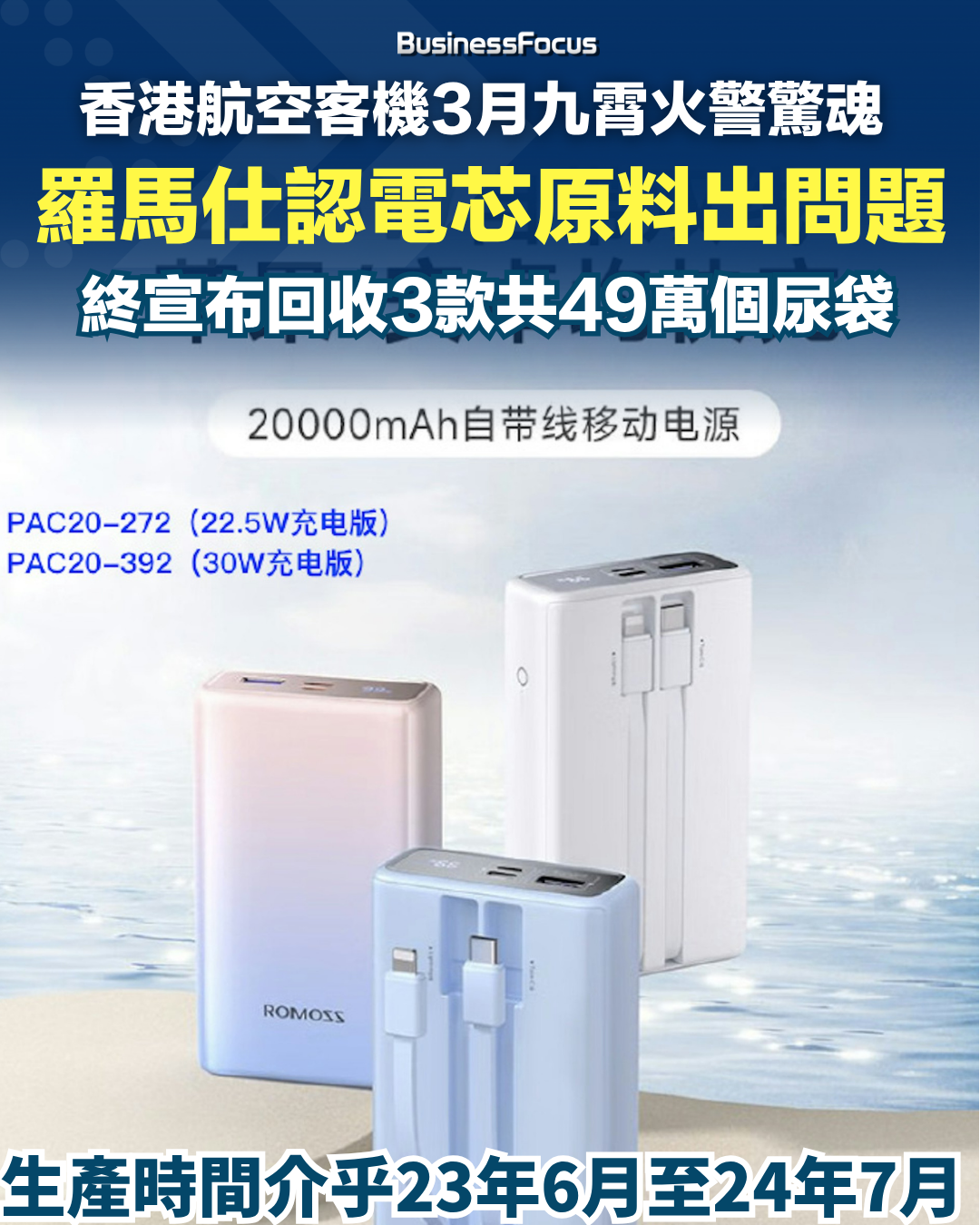 中國深圳品牌羅馬仕(ROMOSS)指出,由於部分電芯原料來料的因素,極少數產品在使用時可能存在過熱現象,在極端情況下更可能會起火,存在安全隱患。雖然起火料極為罕見,但基於安全考慮,羅馬仕已向深圳市市場監管部門報備召回計劃。它指這次回收行動涵蓋 2023年6月至 2024年7月間製造的三款尿袋,回收型號為 PAC20-272、PAC20-392 和 PLT20A-152,總數達491,745部(涉及的詳細批號請看影片或配圖)。