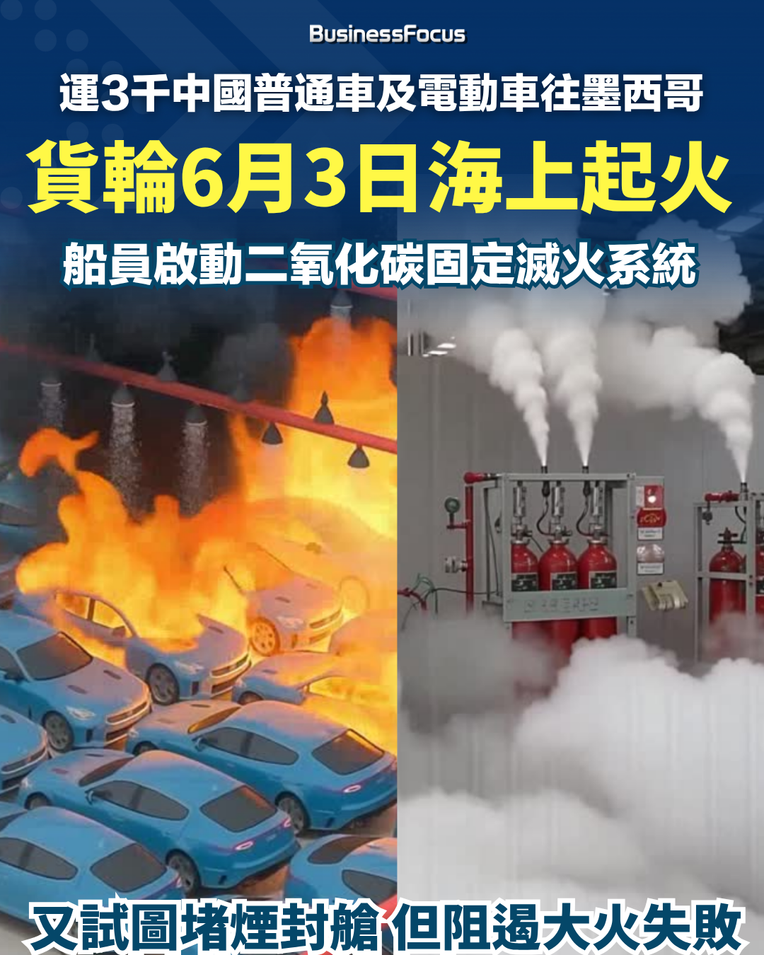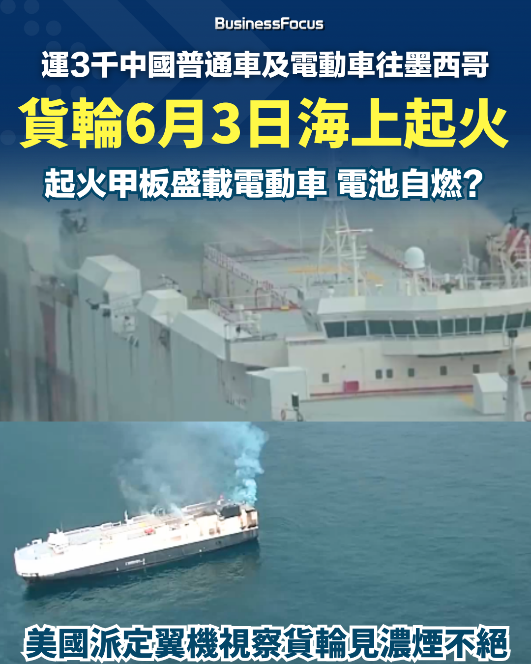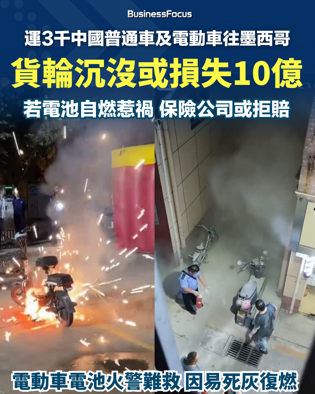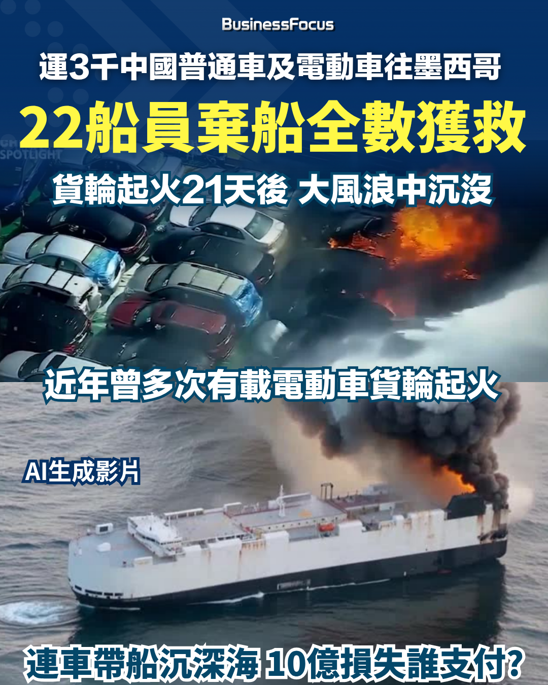 一艘運載逾3,100架中國國產新車的貨輪,上月由中國煙台出發往墨西哥途中,在阿拉斯加對開的太平洋突然起火。雖然22名船員全數獲救,但大火焚燒21天後,貨輪在風浪中沉沒,連船帶車沉進5,000米深的海底,損失或高達10億港元。由於首先起火的甲板運載的是中國電動車,外界猜測火警會否與電動車電池自燃有關。若保險公司以此理據拒賠,中國電動車企業或有機會要承受部分損失。