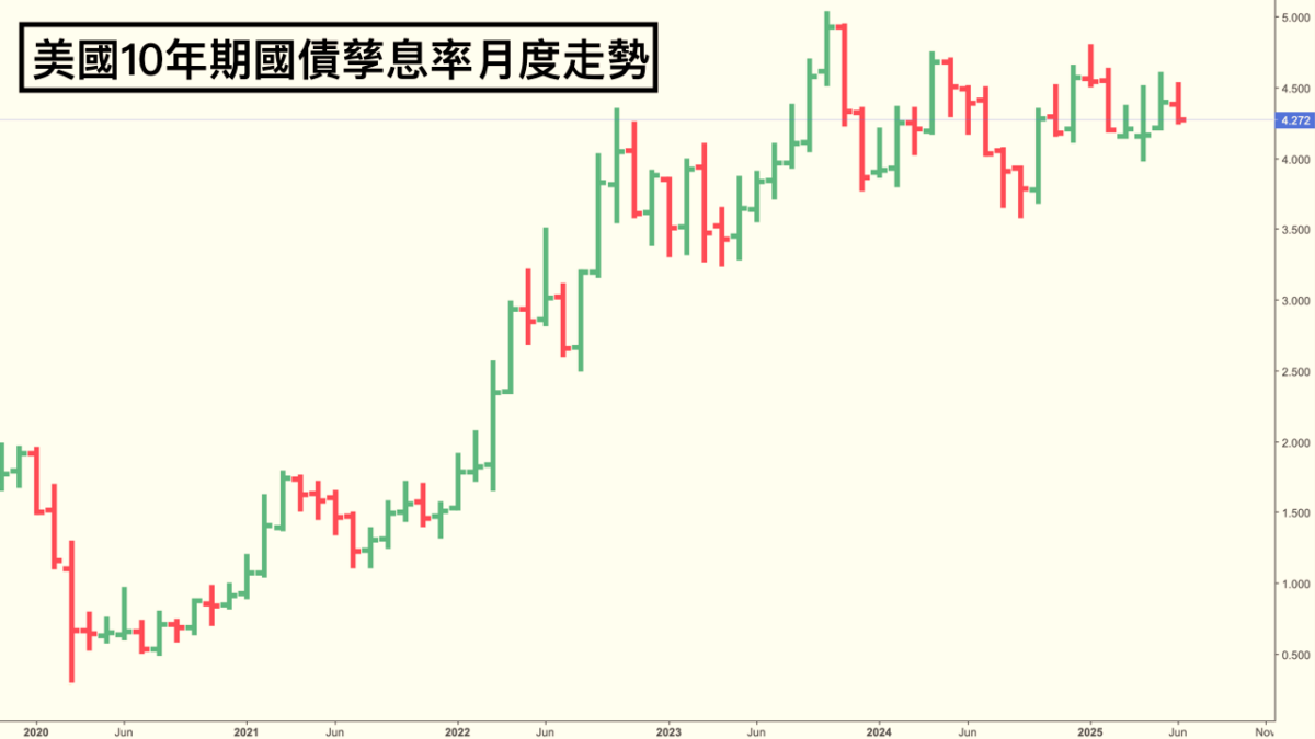 當年金價與這些國家的國債價格走勢恰好相反,從2009年第四季開始金價一直暴升,由大約每安士950美元升至2011年底的1923美元,升幅超過100%。這種金價與國債價格的關係於2020年開始運行至今,大至相同,不同的是,這次不是發生在歐債,而是出現於美債。從美國10年期國債走勢看到,孳息率2020年3月的0.394%一直上升至今接近4.3%,升幅10倍,同期金價則由1650美元起步,升至2025年6月約3350美元,升幅大約100%。