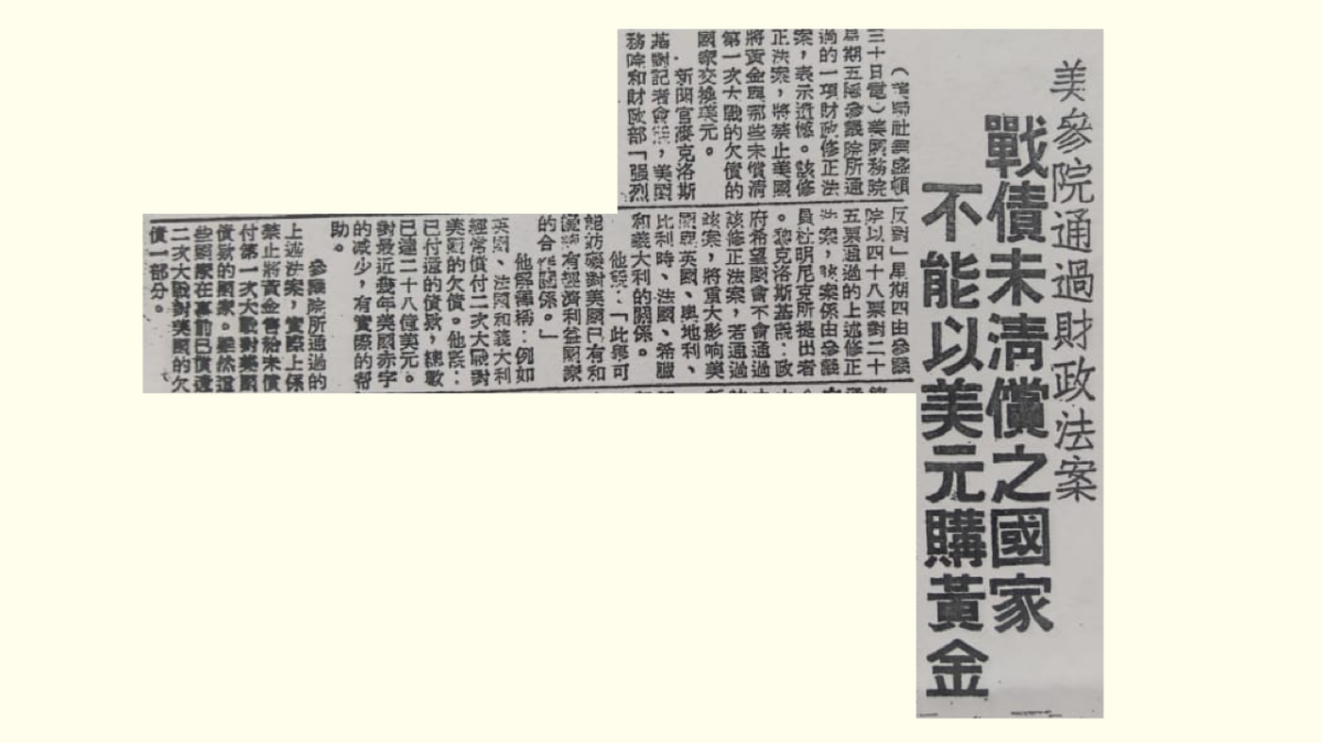 黃金與國家債務的反向關係不是近年才有,早在金本位解體前已經出現,例如1968年美國國會便通一項法案,禁止於第一次世界大戰時未向美國清償戰債的國家,以其手上美元向美國兌換黃金,當時是每35美元可向美國政府兌換1安士黄金。這項法案說明了,當年美國政府購買了其他國家為數不少的「戰爭債券」,後來有國家違約不還,故美國政府就禁止他們用美元兌換黃金,等同宣告黃金比這些國家發行的政府債券,甚至自己發行的美元都更具價值。