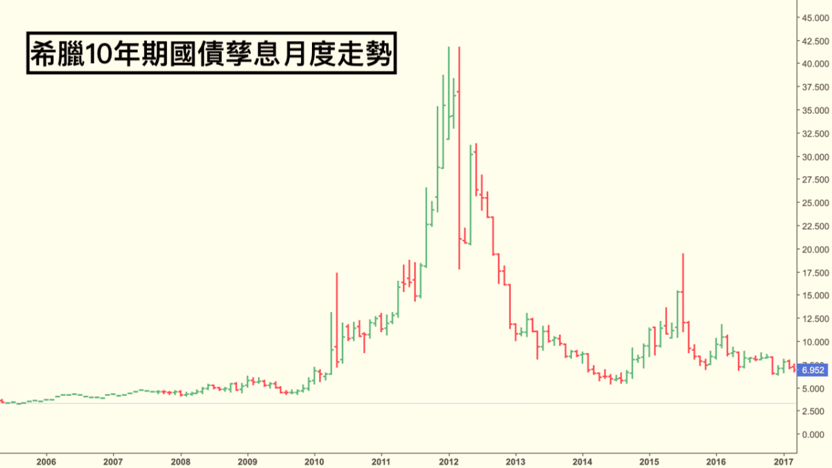 國債的孳息率(Yield)反映了國債在債券市場上自由買賣的價格走勢,孳息率愈高代表價格愈低,從希臘10年期國債孳息率走勢,可以看到大概從2009年第四季度的5%一直暴升至2011年底的超過40%,兩年間升幅800%,反映債價嚴重暴跌。希債如此,其他歐豬當然也無一幸免,甚至遠至冰島,當年也受到歐債危機沖擊,出現嚴重債務危機,冰債被投資者大舉拋售。