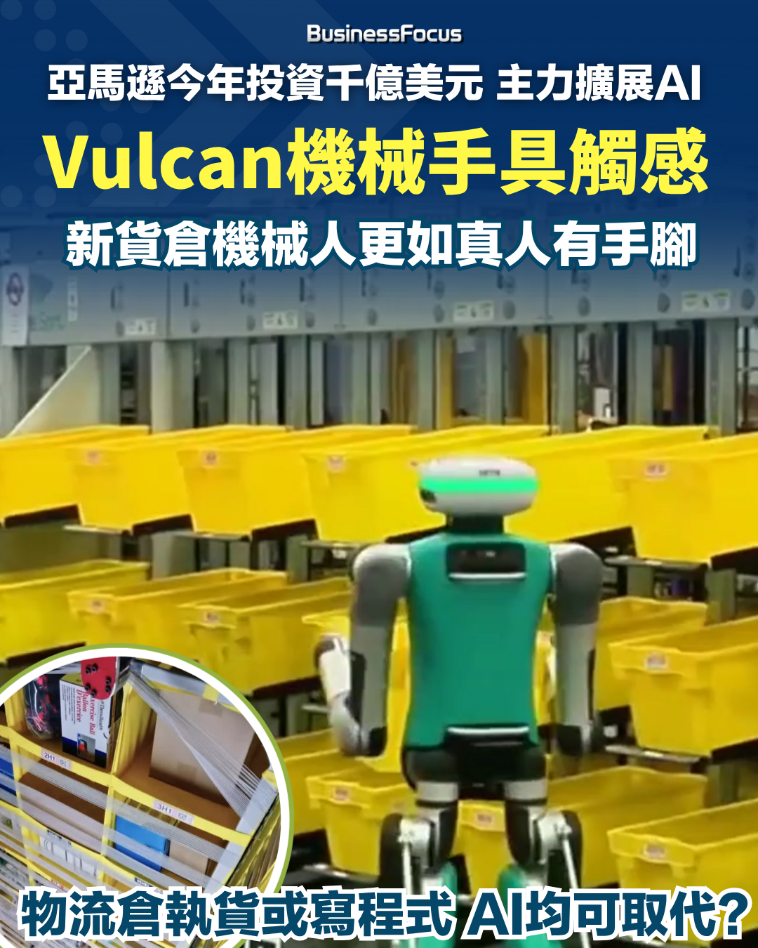 但更強的AI機械人陸續有來!亞馬遜一款較新穎及名為Vulcan的機械人(機械手)即擁有類似人類觸覺,這使其能夠從眾多貨架上取貨,包括一些要「小心輕放」的食品或易碎物品。人形機器人製造商Agility Robotics更透露,亞馬遜已經在測試一款最新式的人形機器人(DIGIT)。亞馬遜稱,有腳、有手、有頭的機械人已經在亞馬遜進行回收容器等任務的測試。從網上影片所見,這款人形機械人「健步如飛」,可以搬大型紙箱,要蹲下也沒有問題,機械手也很靈活。難怪不少亞馬遜負責「執倉」「分揀貨物」的前線員工,對工作前景均感到憂慮。