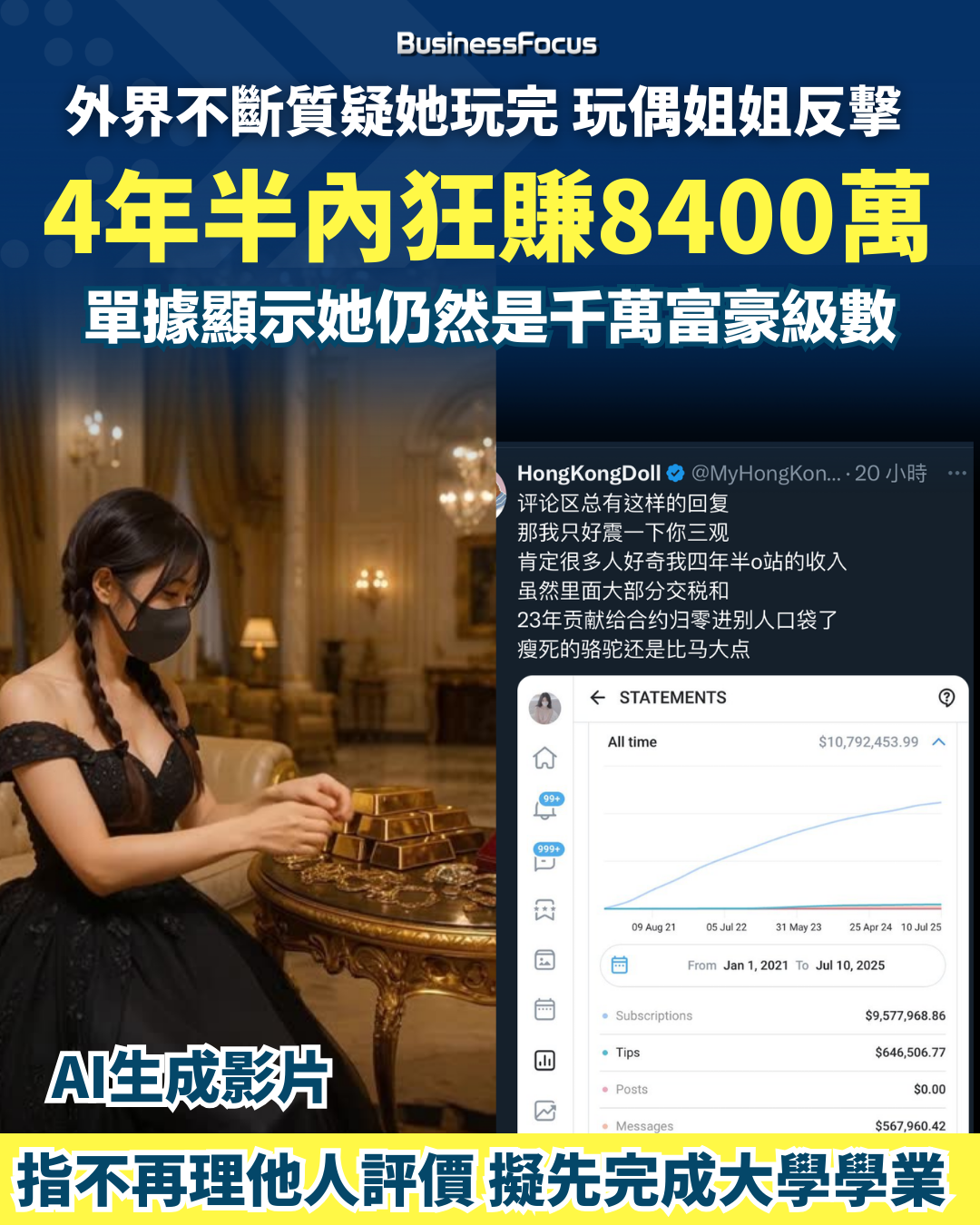 玩偶姐姐(HongKongDoll)2021年在OnlyFans平台崛起,她雖拍大膽影片但從不脫下口罩,「賣神秘、賣清純」,成為香港最出名成人網紅之一。不過她近年不斷遭網民狙擊兼禍不單行,她先是被踢爆不是港人,以及口罩之下樣貌平凡,2023年更因投資失利導致損失多達800萬美元(約6,240萬港元),令身家幾乎歸零。但玩偶姐姐最新發帖反擊,透露她原來過去4年半在OnlyFans平台的累積收入竟高達1,079萬美元(約8,418萬港元),意味她即使投資失利,仍是千萬富翁。