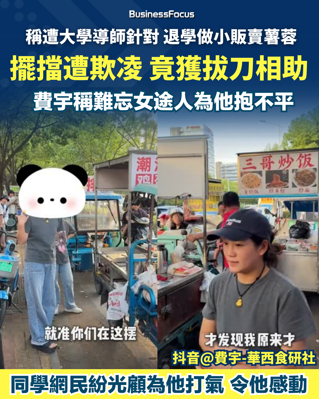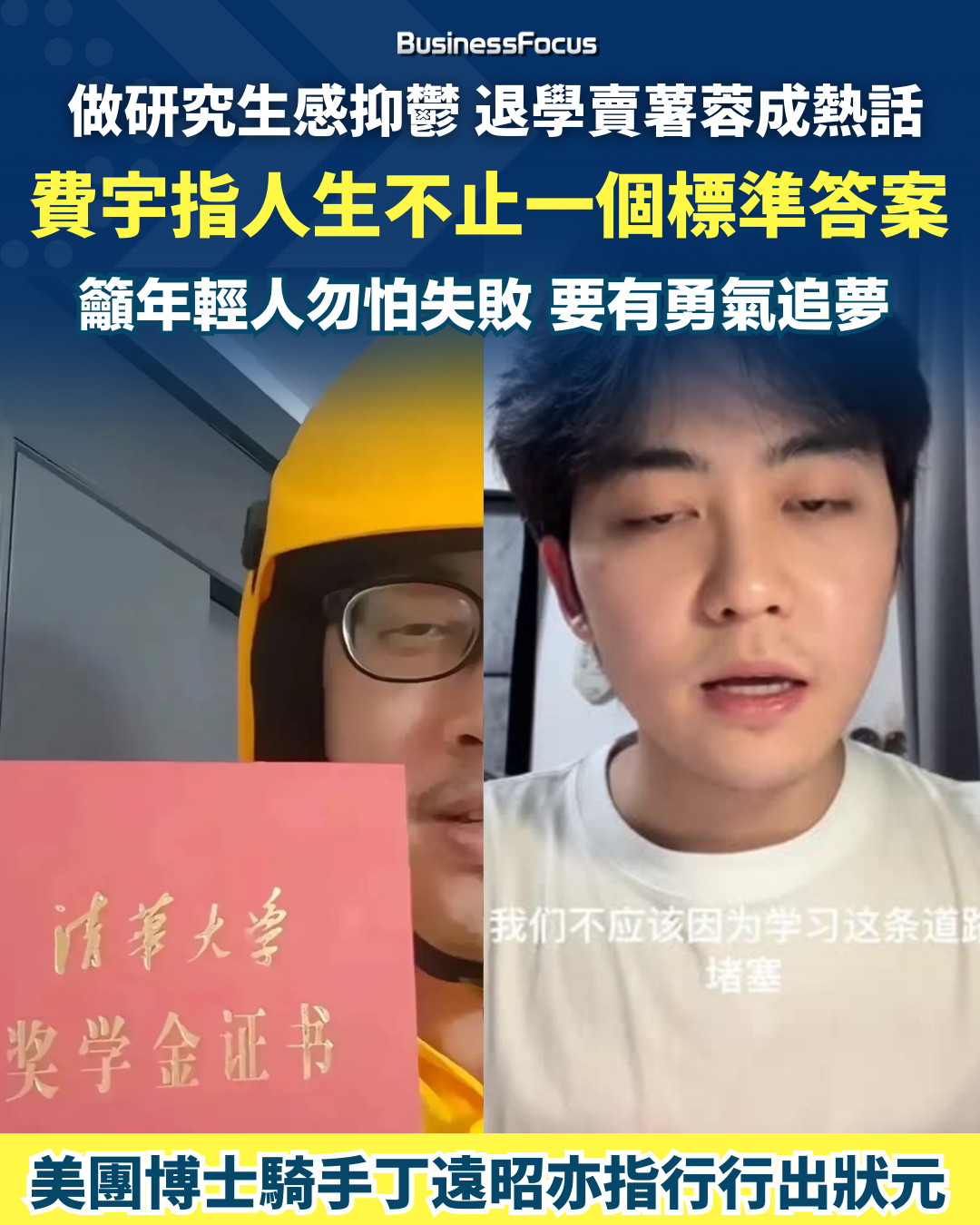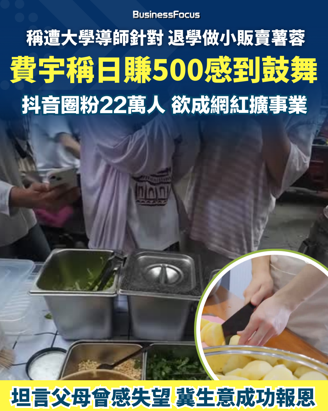 中國內捲成風,高學歷人士如碩士博士均就業困難,內地近月除了出現「美團博士騎手」,曾經是四川高考學霸的24歲青年費宇,亦因為在復旦大學做研究生時與大學導師出現爭拗,致一度陷入抑鬱,最終毅然退學做小販賣薯蓉及做自媒體,引來全城熱議。對於有網民疑他浪費了國家教育資源,費宇稱退學屬無可奈何,但他強調「人生沒有標準答案」,認為行行出狀元。他更鼓勵年輕人要去追夢,勿害怕失敗。