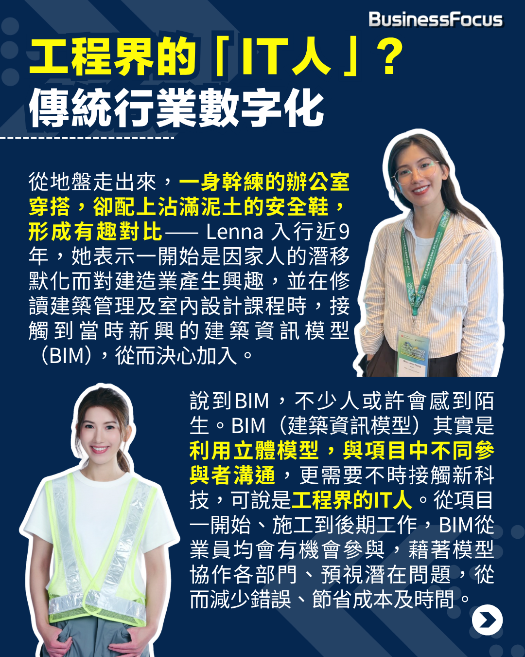 從地盤走出來,一身幹練的辦公室穿搭,卻配上沾滿泥土的安全鞋, 形成有趣對比—— Lenna 入行近9年,她表示一開始是因家人的潛移默化,而對建造業產生興趣。她在修讀建築管理及室內設計課程時,接觸到當時新興的建築資訊模型(Building Information Modeling,簡稱BIM),並在實習後決心加入BIM行業。