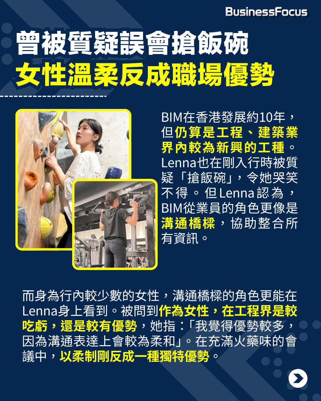 這個行業在香港發展約10年,但仍算是工程、建築業界內較為新興的行業。Lenna也在剛入行時被質疑「搶飯碗」,令她哭笑不得。「我記得在地盤(on site)時,一些年長叔叔會半開玩笑地說:『畫圖啊?我哋唔使做㗎啦!』」但Lenna認為,BIM從業員的角色,更像是溝通橋樑,協助整合所有資訊。而身為行內較少數的女性,溝通橋樑的角色更能在Lenna身上看到。被問到作為女性,在工程界是較吃虧,還是較有優勢,她指:「我覺得優勢較多,因為溝通表達上會較為柔和」。在充滿火藥味的會議中,以柔制剛反成一種獨特優勢。「我們(女生)進去會令整件事情反而平靜下來。」她續說,這種柔和力量,能讓團隊重新聚焦於解決問題,而不是因人事摩擦而爭吵,對項目推進有所幫助。