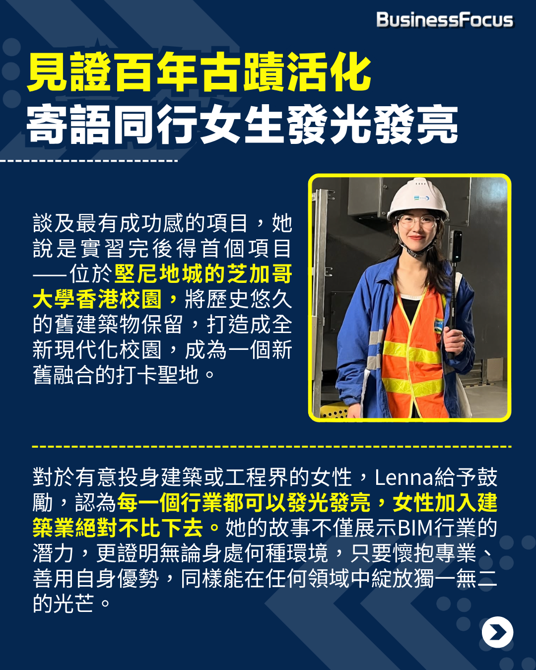 對於有意投身建築或工程界的女性,Lenna給予了鼓勵。她認為在每一個行業都可以發光發亮,女性加入建築業絕對不比下去。她的故事不僅展示BIM行業的潛力,更證明無論身處何種環境,只要懷抱專業、善用自身優勢,同樣能在任何領域中綻放獨一無二的光芒。