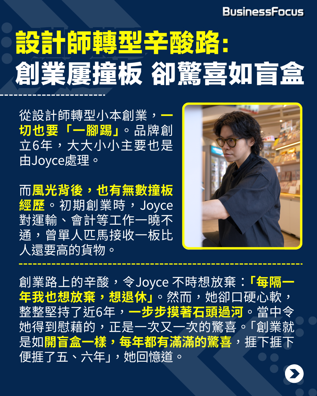 而風光背後,也有無數「撞板」經歷。本身是設計師的Joyce,坦言初期創業時,對運輸、會計等工作一曉不通。她分享一段深刻的辛酸史,指當時有一批貨送到碼頭,她一人到場收貨,卻發現自己低估了一板貨的重量。「原來一板貨是超級龐大,比我整個人還要高」,最後她只能硬著頭皮,推著貨物在路邊周圍截車。